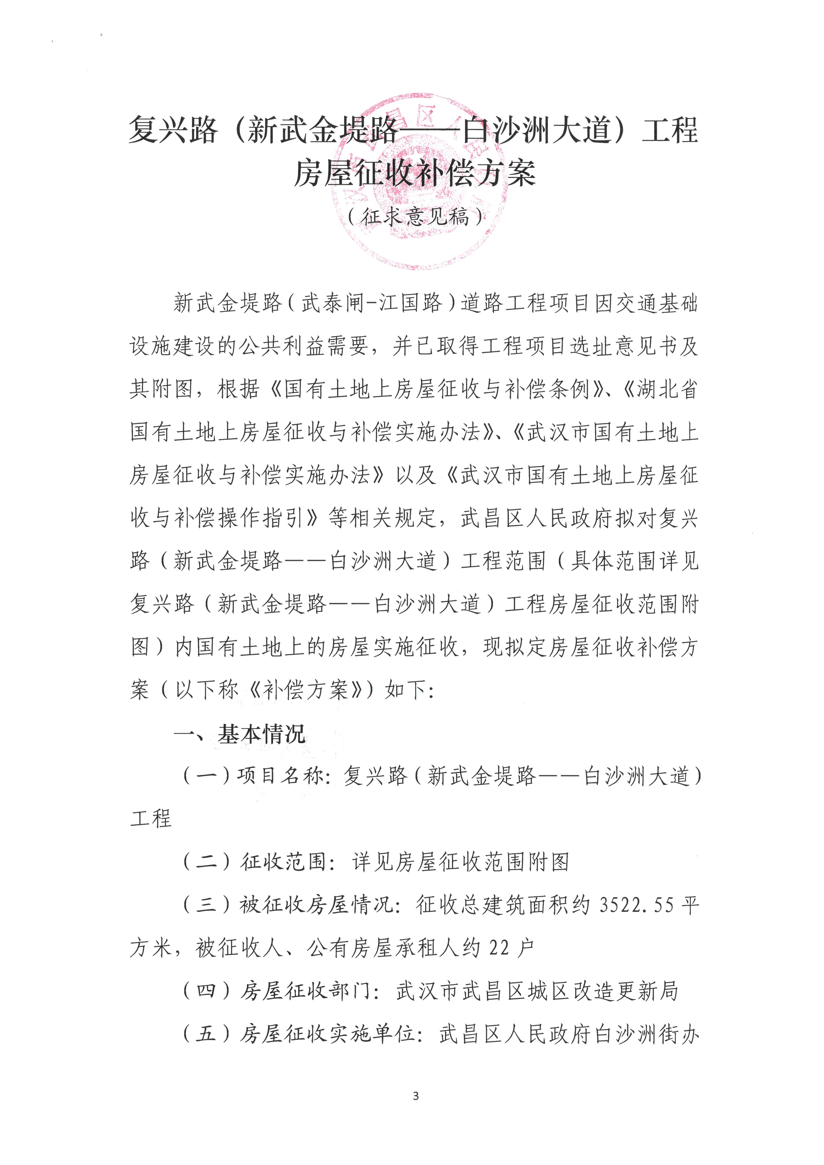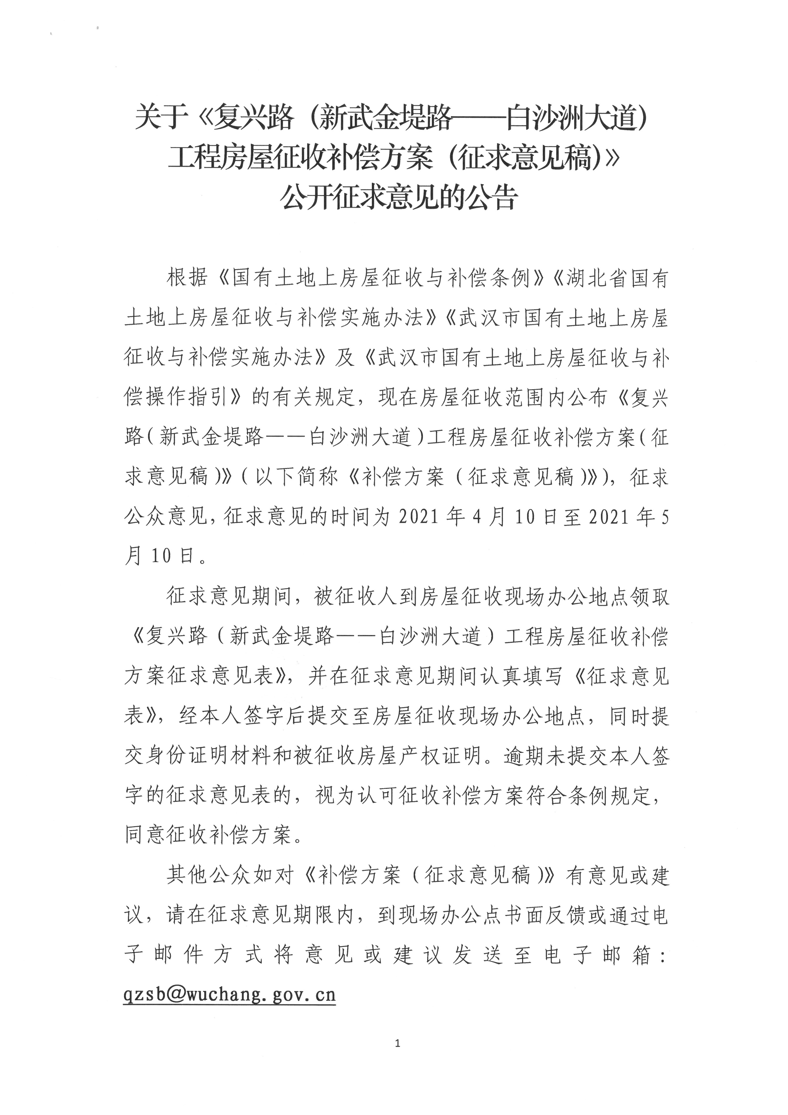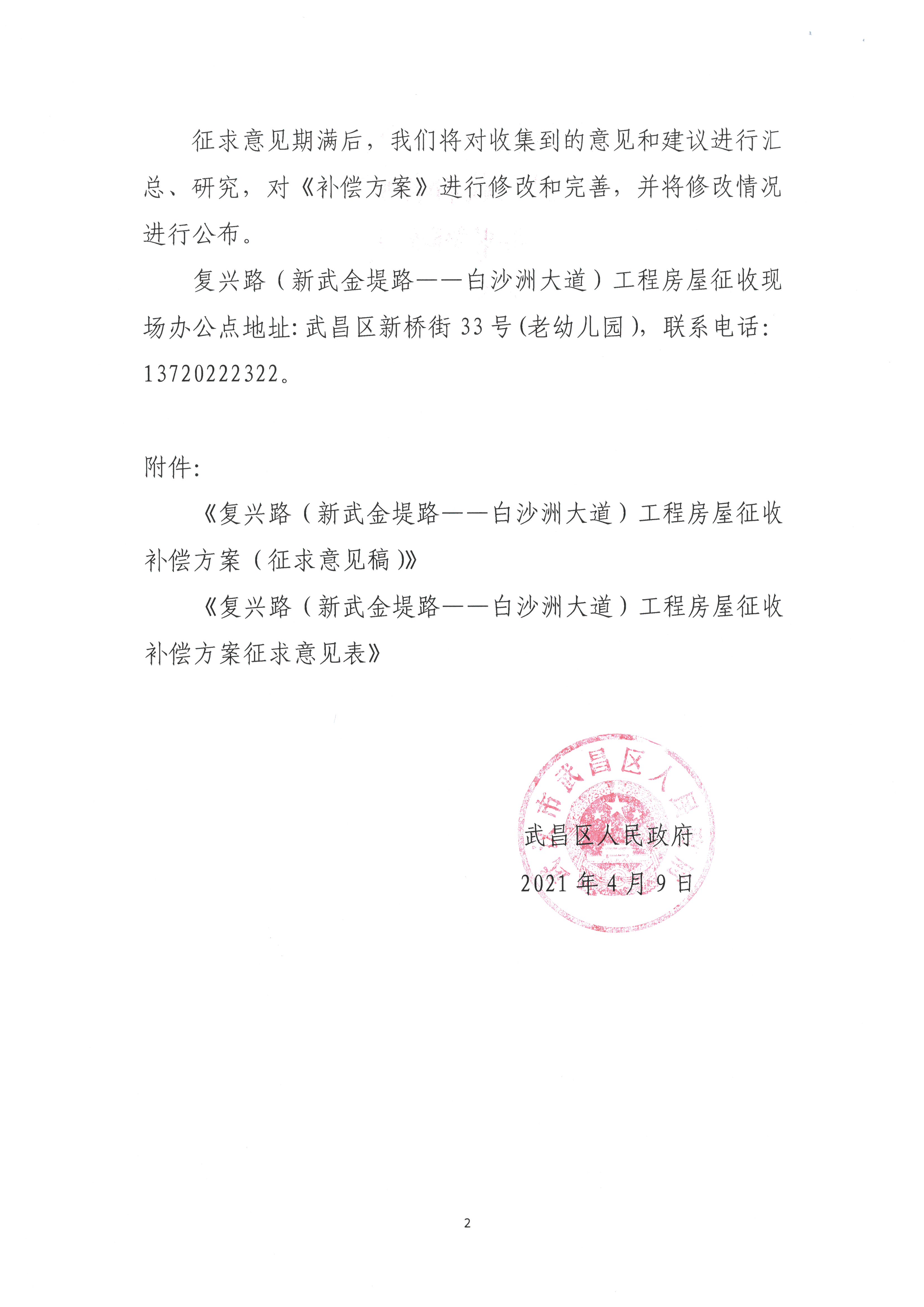 关于《复兴路(新武金堤路——白沙洲大道)工程房屋征收补偿方案(征求意见稿)》公开征求意见的公告