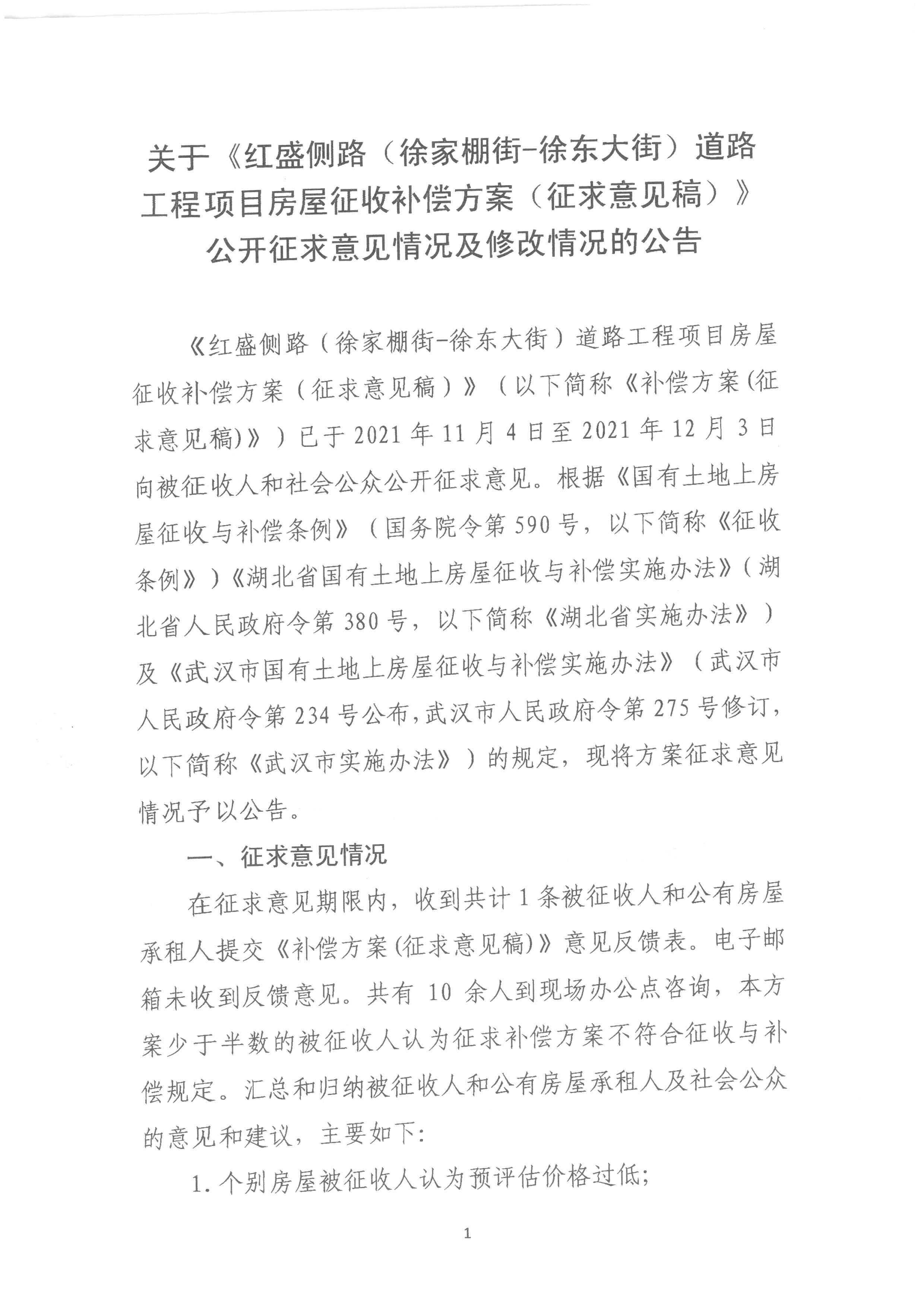关于《红盛侧路(徐家棚街——徐东大街)道路工程项目房屋征收补偿方案(征求意见稿)》公开征求意见情况及修改情况的公告