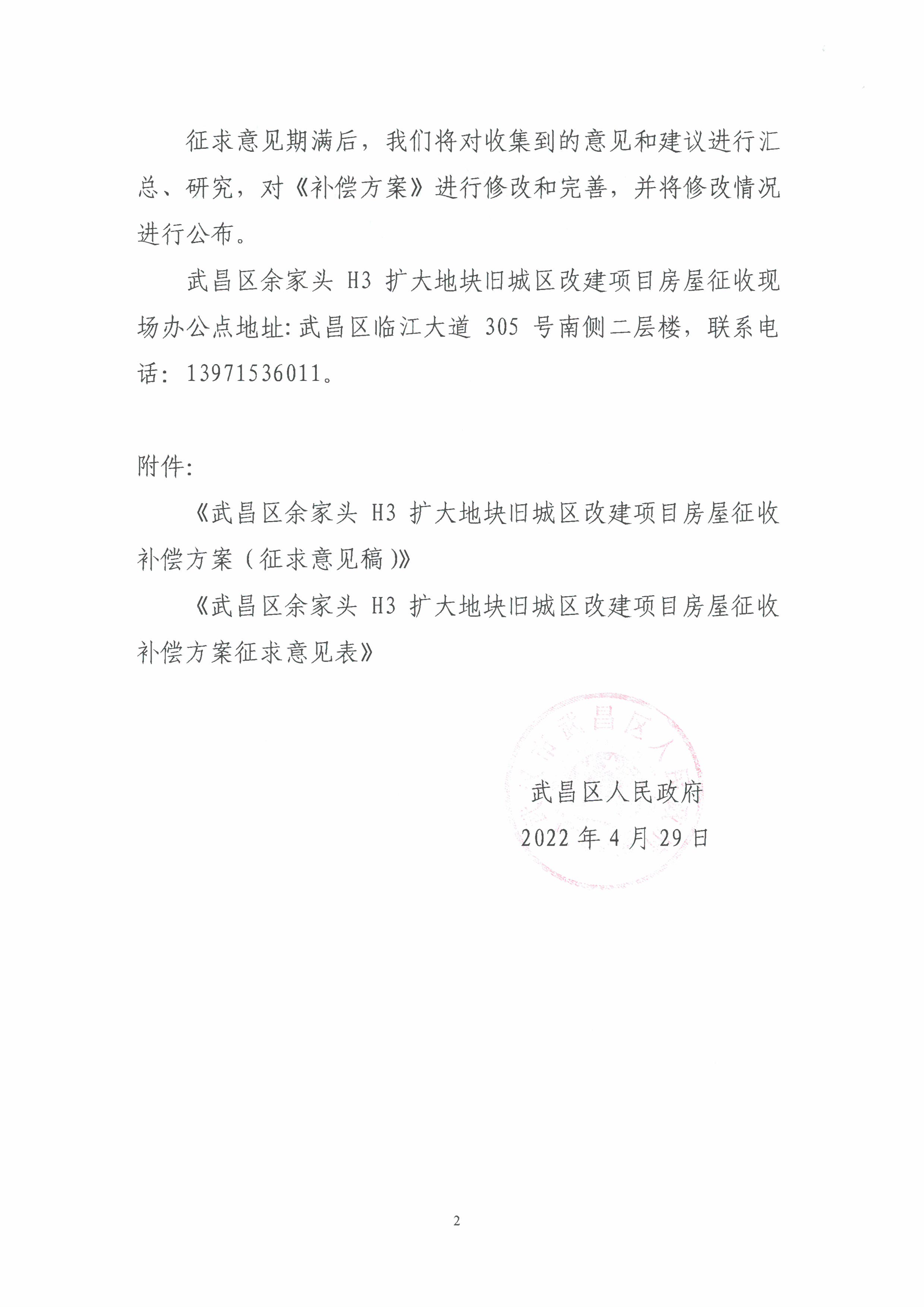 关于《武昌区余家头H3扩大地块项目房屋征收补偿方案(征求意见稿)》公开征求意见的公告
