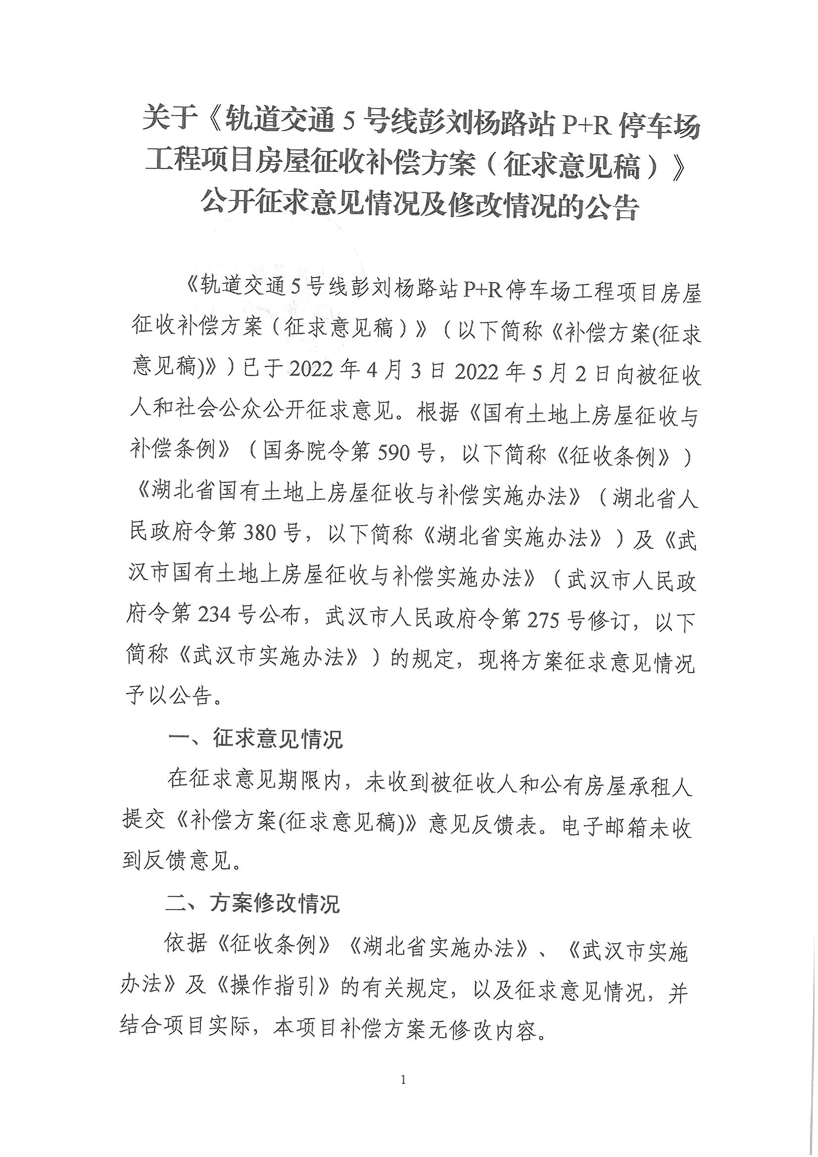 关于《轨道交通5号线彭刘杨路站P+R停车场工程项目房屋征收补偿方案(征求意见稿)》公开征求意见情况及修改情况的公告
