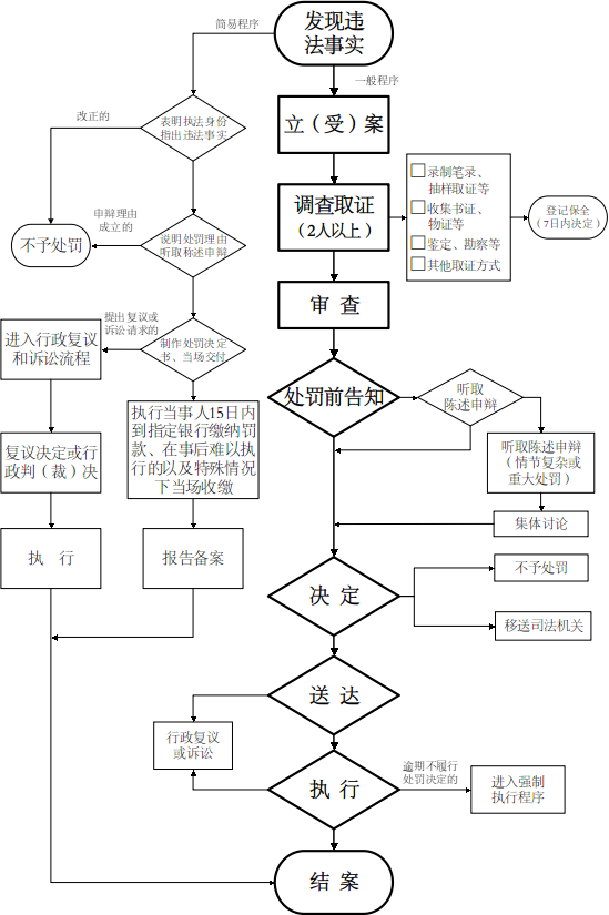 3.《中华人民共和国行政处罚法》第五十七条 调查终结,行政机关负责人应当对调查结果进行审查,根据不同情况,分别作出如下决定:(一)确有应受行政处罚的违法行为的,根据情节轻重及具体情况,作出行政处罚决定;(二)违法行为轻微,依法可以不予行政处罚的,不予行政处罚;(三)违法事实不能成立的,不予行政处罚;(四)违法行为涉嫌犯罪的,移送司法机关。对情节复杂或者重大违法行为给予行政处罚,行政机关负责人应当集体讨论决定。