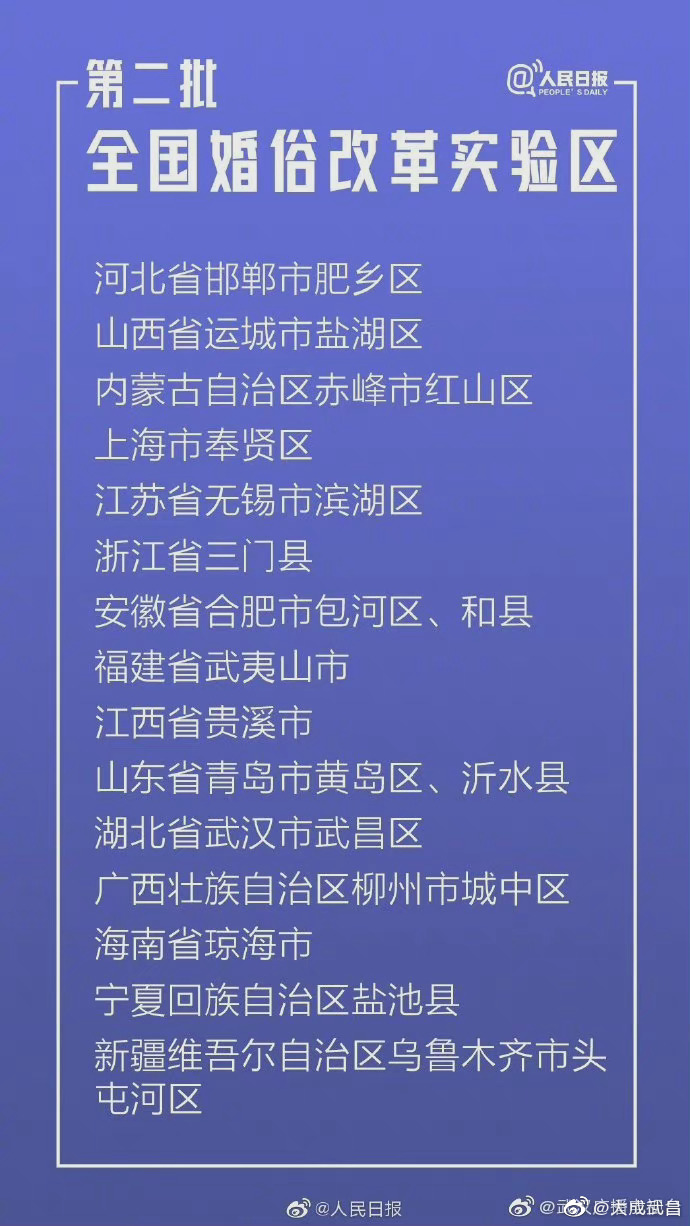 【#17地列为全国婚俗改革实验区#,武汉市武昌区在列】近日,民政部将河北邯郸市肥乡区、山西运城市盐湖区等17个单位确认为#第二批全国婚俗改革实验区#。实验时间自2021年9月起至2024年9月止。这些实验区将对婚嫁陋习、天价彩礼等不良社会风气进行治理,助力婚姻家庭幸福稳定。武汉市武昌区名列其中~~