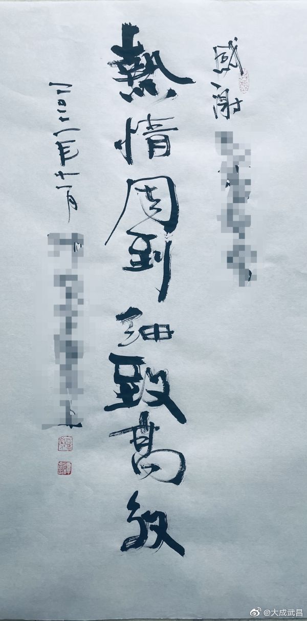 #武昌政务# 【量身定制解决方案,大学教师手书锦旗致谢窗口民警】11月10日,大学老师谭先生来到武昌区政务服务中心公安窗口,办理落户业务的同时,还带来了一份特殊的“礼物”——一幅由他书写的“热情周到 细致高效”字样的书法作品。在艺术学院任职的他以手书锦旗的方式,感谢窗口民警帮其量身定制解决方案。