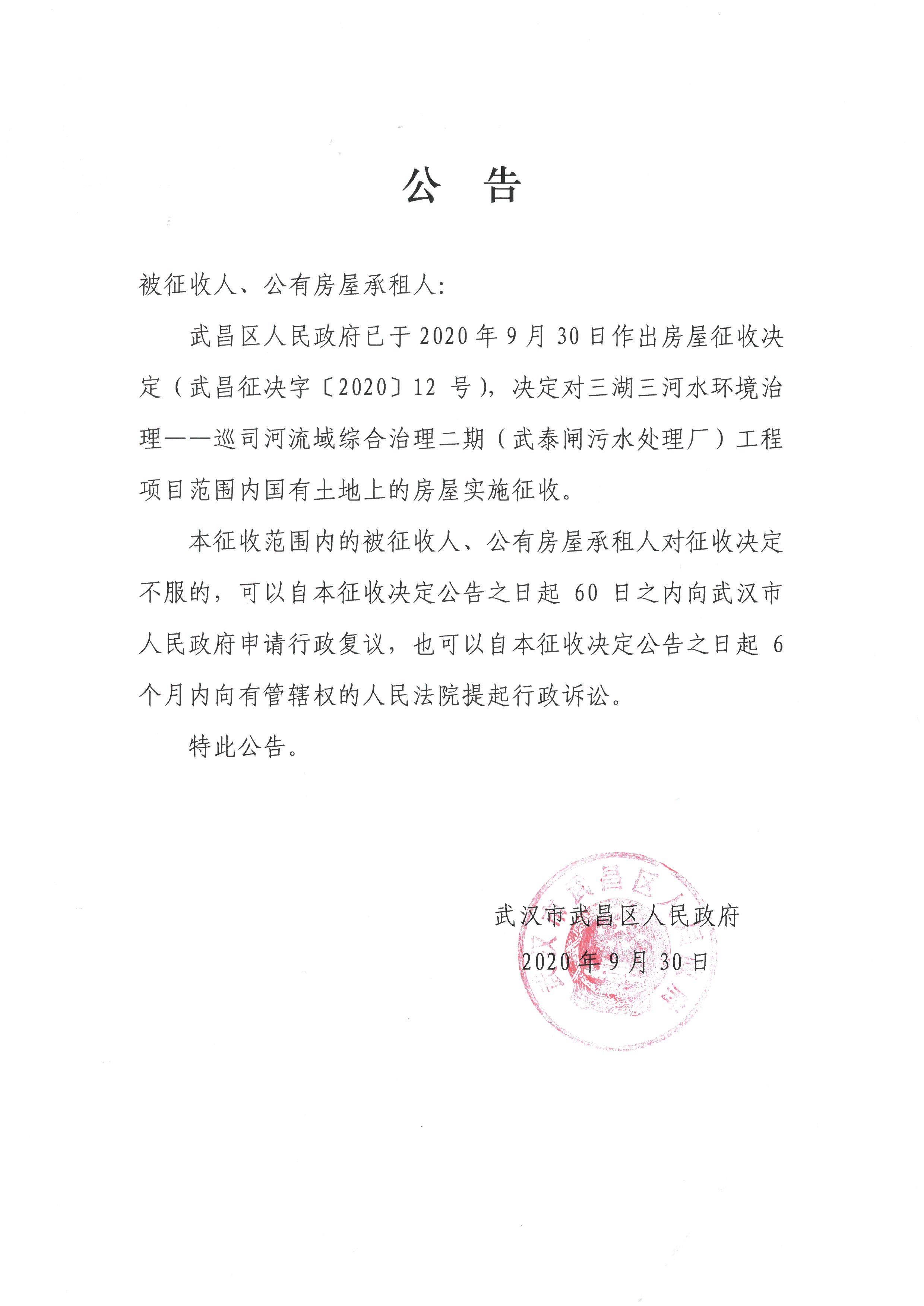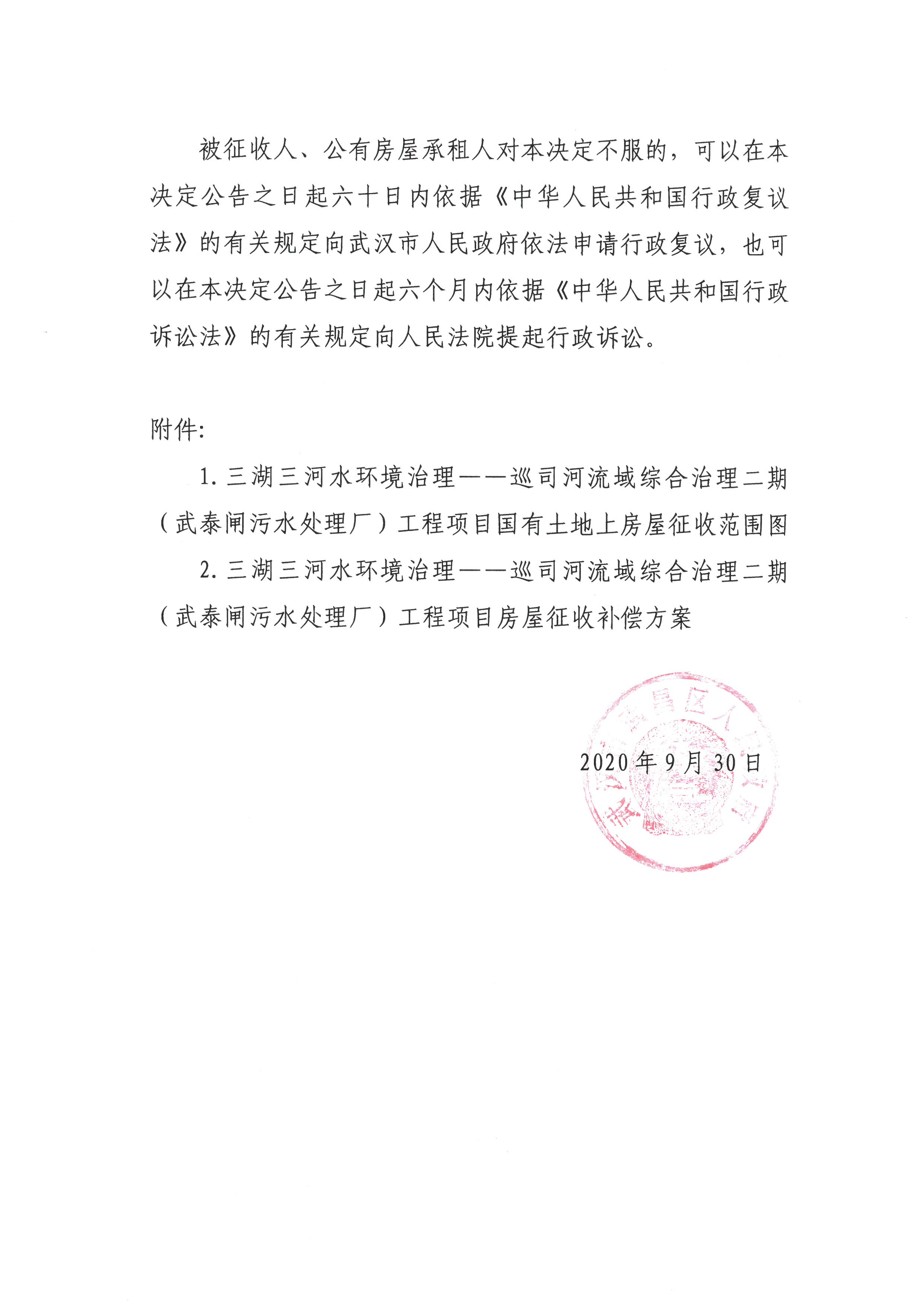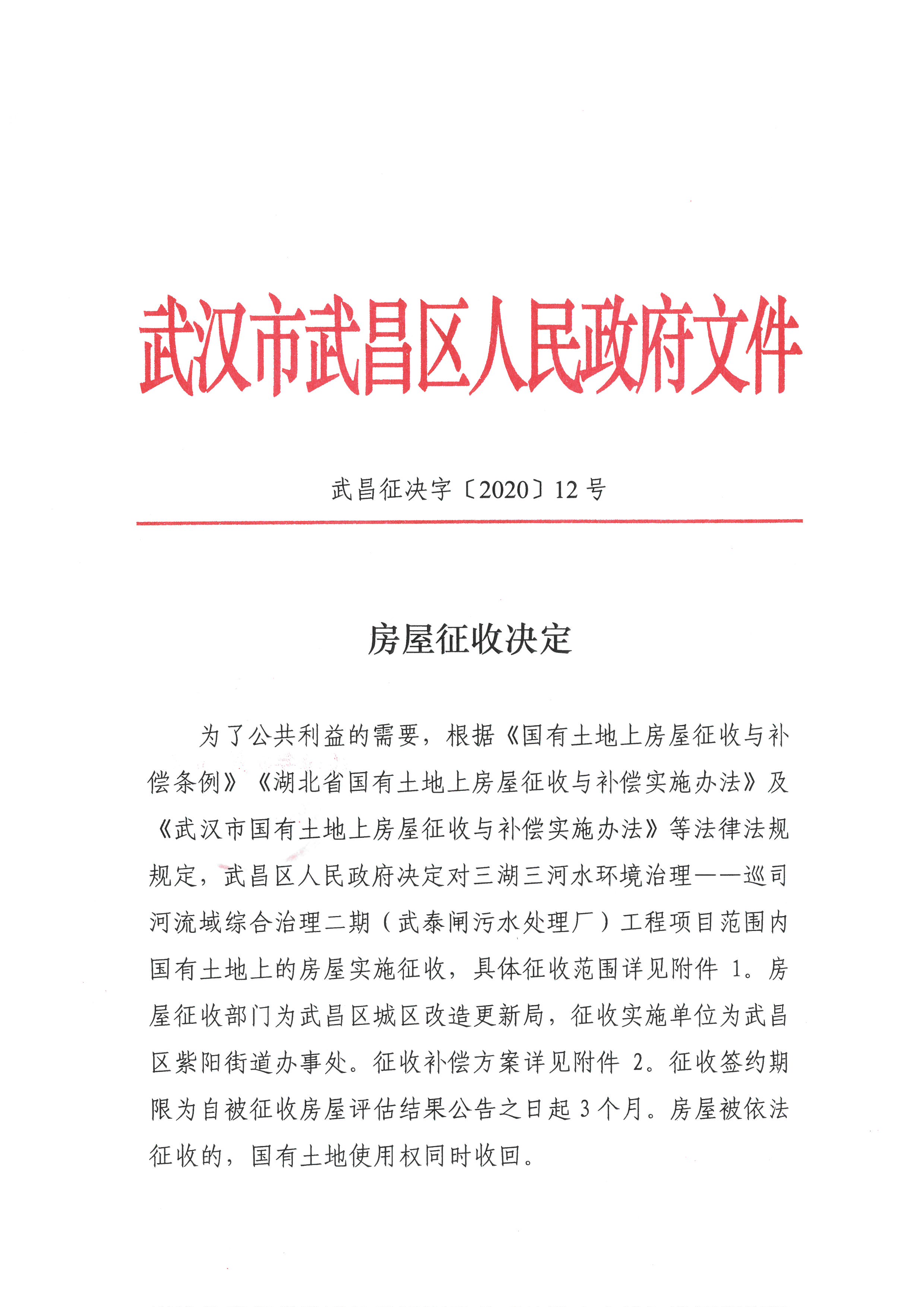 三湖三河水环境治理——巡司河流域综合治理二期(武泰闸污水处理厂)工程项目国有土地上房屋征收决定的公告