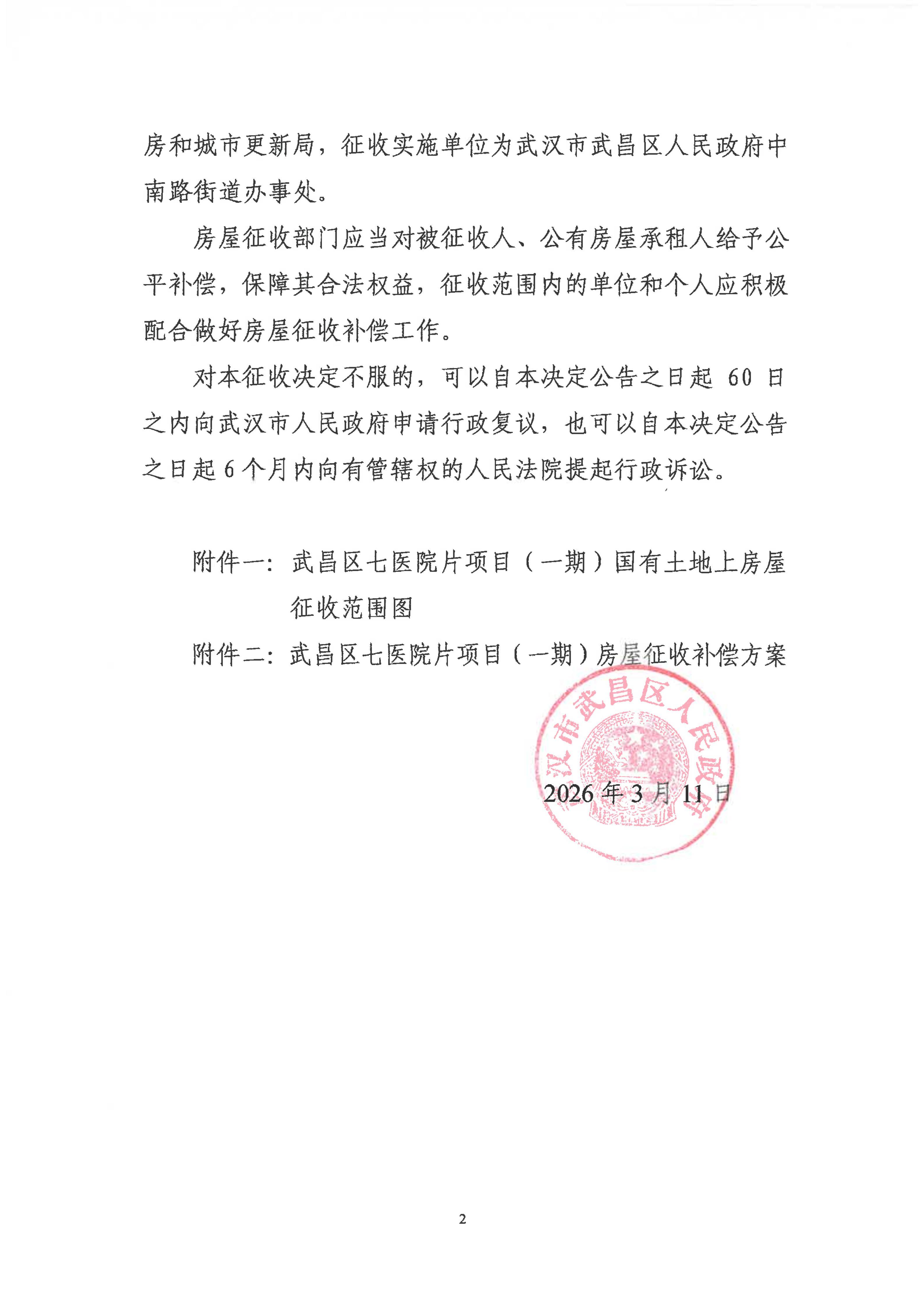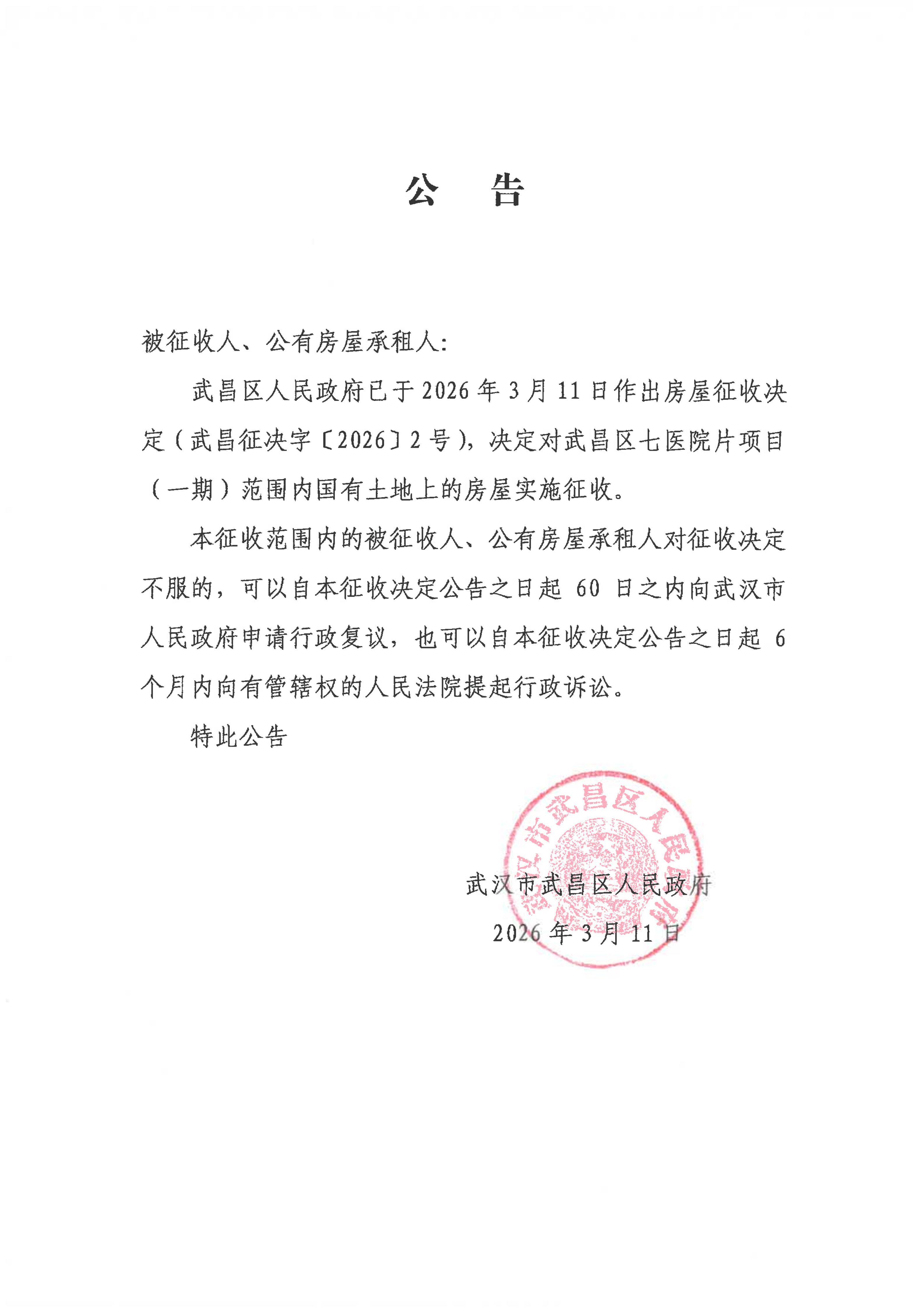 房屋征收决定【武昌区七医院片项目(一期)】
