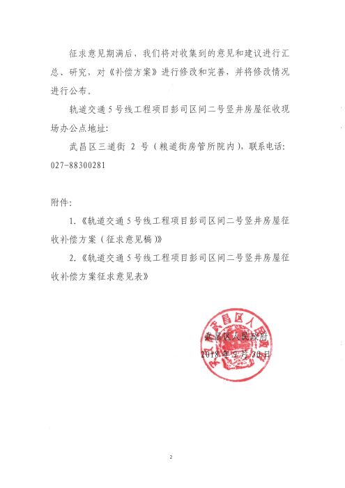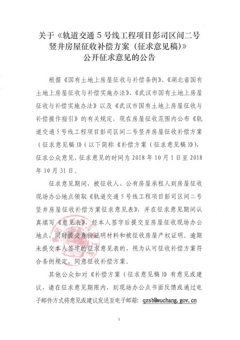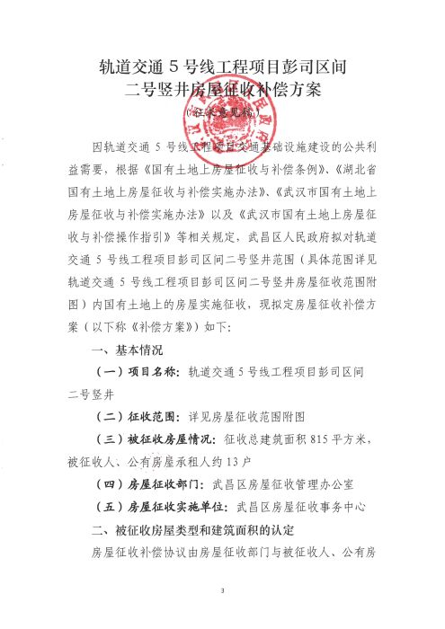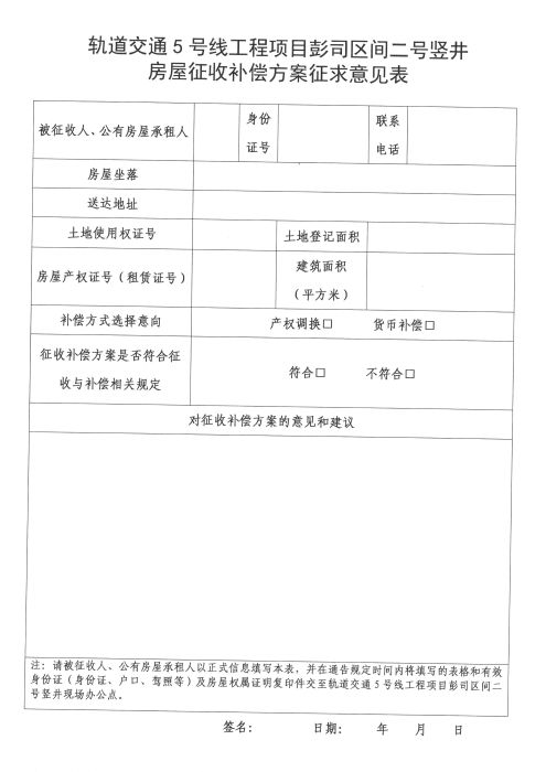 关于《轨道交通5号线工程项目彭司区间二号竖井国有土地上房屋征收补偿方案(征求意见稿)》公开征求意见的公告