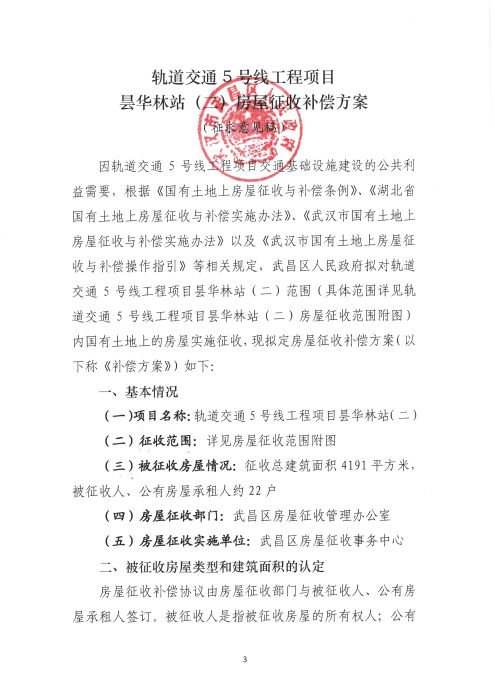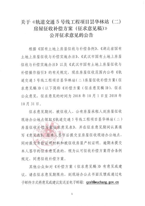 关于《轨道交通5号线工程项目昙华林站(二)国有土地上房屋征收补偿方案(征求意见稿)》公开征求意见的公告