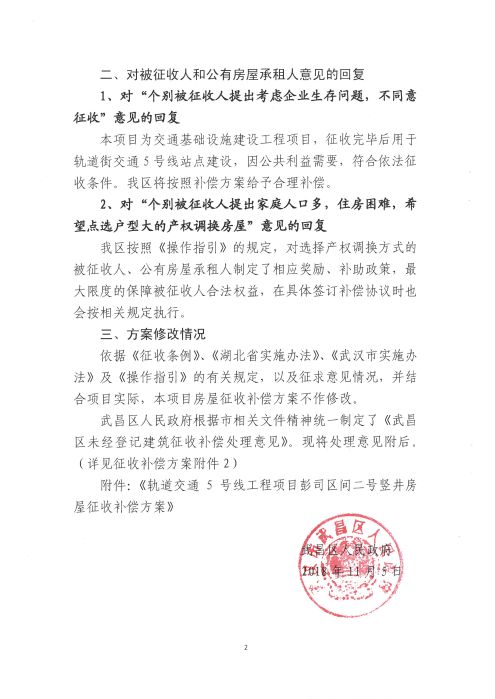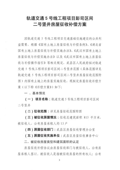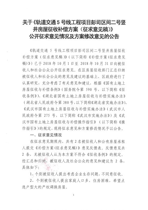 关于《轨道交通5号线工程项目彭司区间二号竖井房屋征收补偿方案(征求意见稿)》 公开征求意见情况及方案修改意见的公告