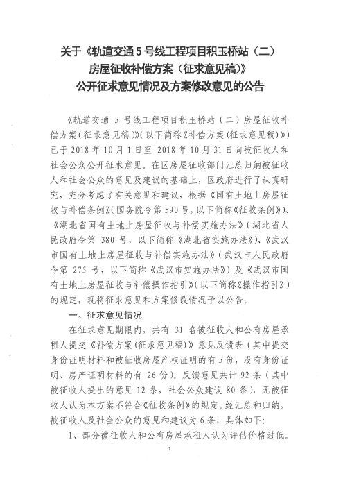 关于《轨道交通5号线工程项目积玉桥站(二) 房屋征收补偿方案(征求意见稿)》 公开征求意见情况及方案修改意见的公告