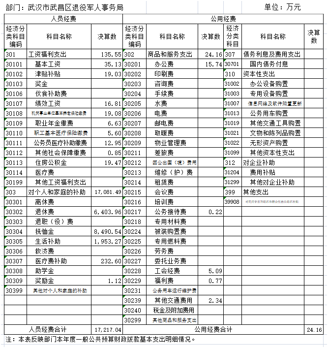 2019度一般公共预算财政拨款基本支出17,241.20万元,其中,人员经费17,217.04万元,主要包括:基本工资、津贴补贴、奖金、绩效工资、机关事业单位基本养老保险缴费、职业年金缴费、职工基本医疗保险缴费、其他社会保险缴费、住房公积金、医疗费、其他工资福利支出、退休费、抚恤金、生活补助、救济费、医疗费补助、奖励金、其他对个人和家庭补助等;公用经费24.16万元,主要包括:办公费、水费、电费、邮电费、差旅费、因公出国(境)费用、维修(护)费、租赁费、会议费、培训费、公务接待费、工会经费、福利费、其他交通费用、其他商品服务支出、办公设备购置等。