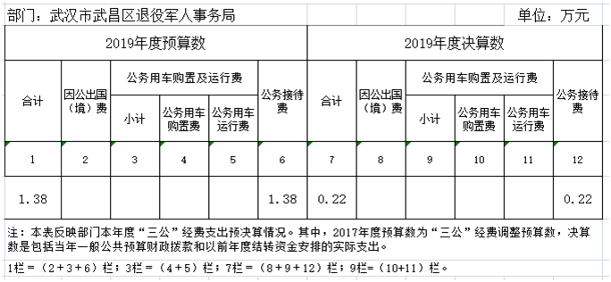 2019年度“三公”经费财政拨款支出决算数比2018年增加0.22万元,增长0 %,其中:因公出国(境)支出决算增加0万元;公务用车购置及运行费支出决算减少0万元,降低0 %;公务接待支出决算增加 0.22万元,增长0%。因机构改革,是新成立单位,无2018年数据可比。公务接待支出决算增加的主要原因是退役军人事务部、外省单位来武昌调研退役军人服务体系建设等。