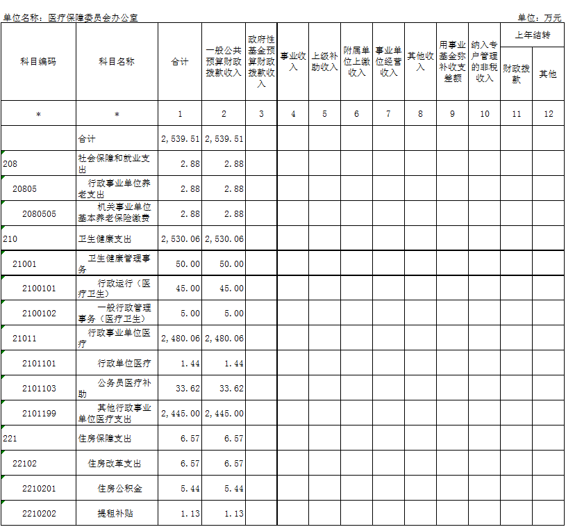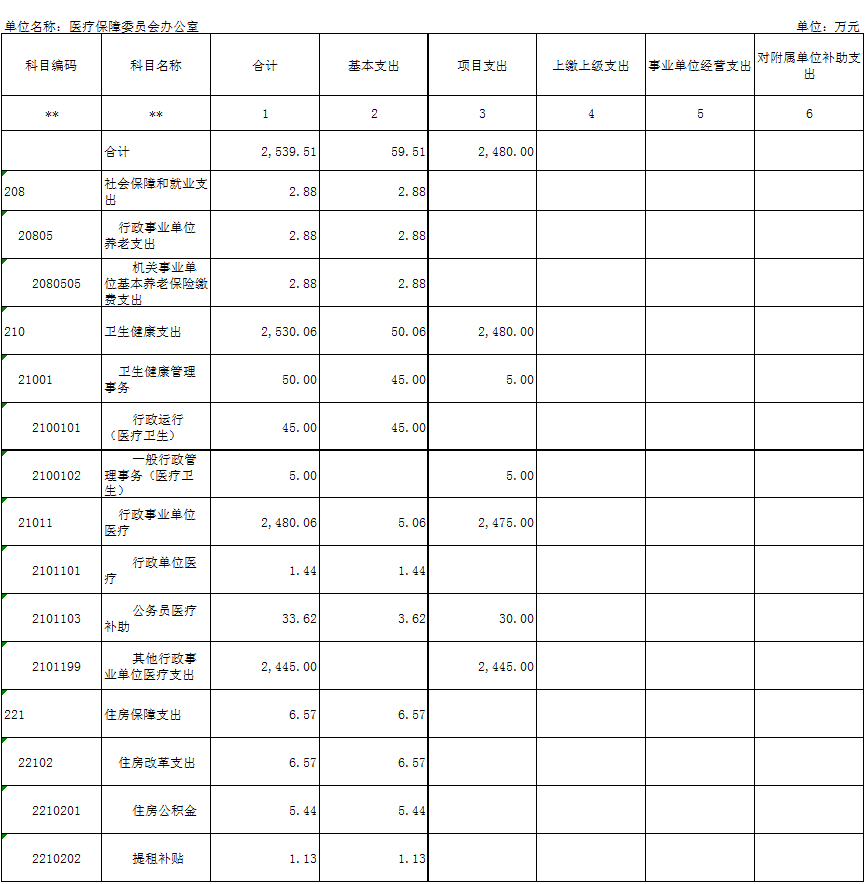 社会保障和就业支出2.88万元;卫生健康支出2530.06万元;住房保障支出6.57万元。