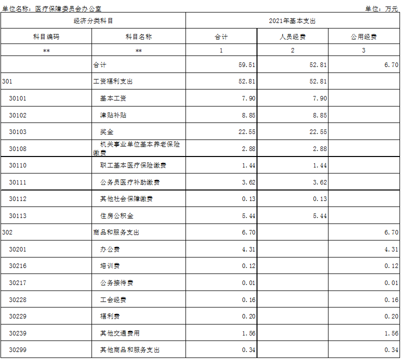(一)基本支出59.51 万元,比2020年预算减少2836.34万元,下降97.84 %,主要原因:将公费医疗专项经费、易肇事肇祸精神病人专项救治经费、子女统筹指标款、公务员医疗补助调整到项目支出。