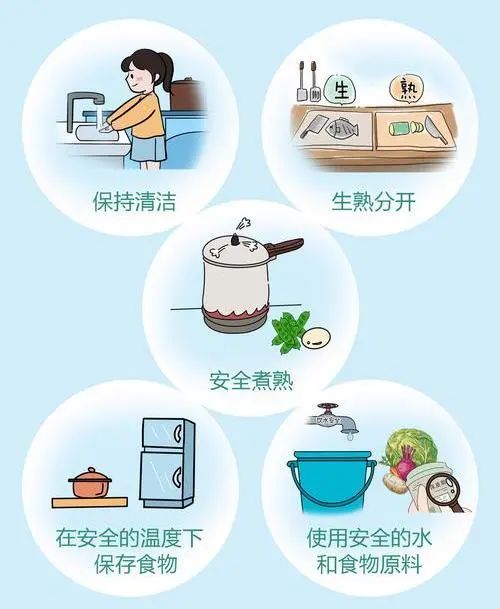 对于健康成人和儿童来说,只要遵循“食品安全五要点”(生熟分开、保持清洁、烧熟煮透、安全温度、安全原料)就基本无忧。