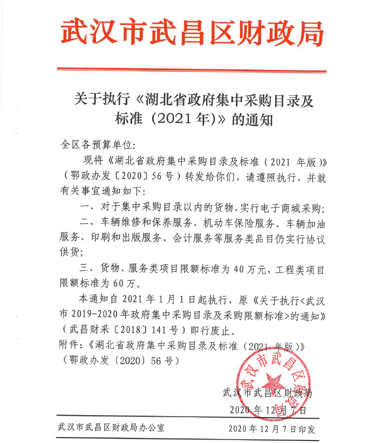 武昌区财政局关于执行《湖北省政府集中采购目录及标准(2021年)》的通知