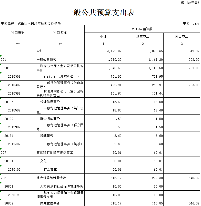 2019年杨园街一般公共预算支出表