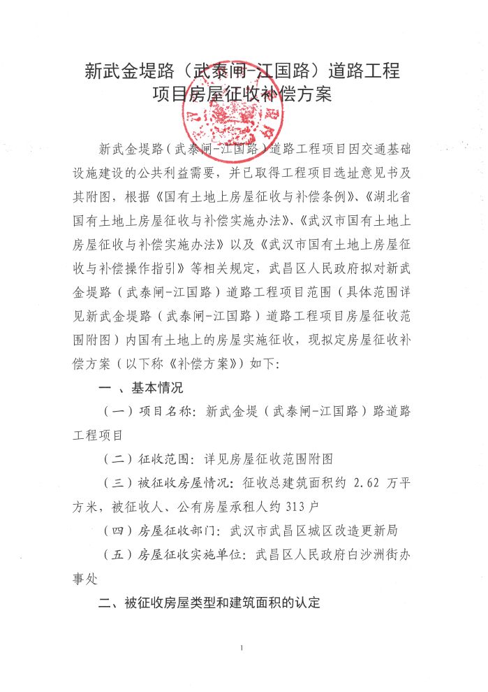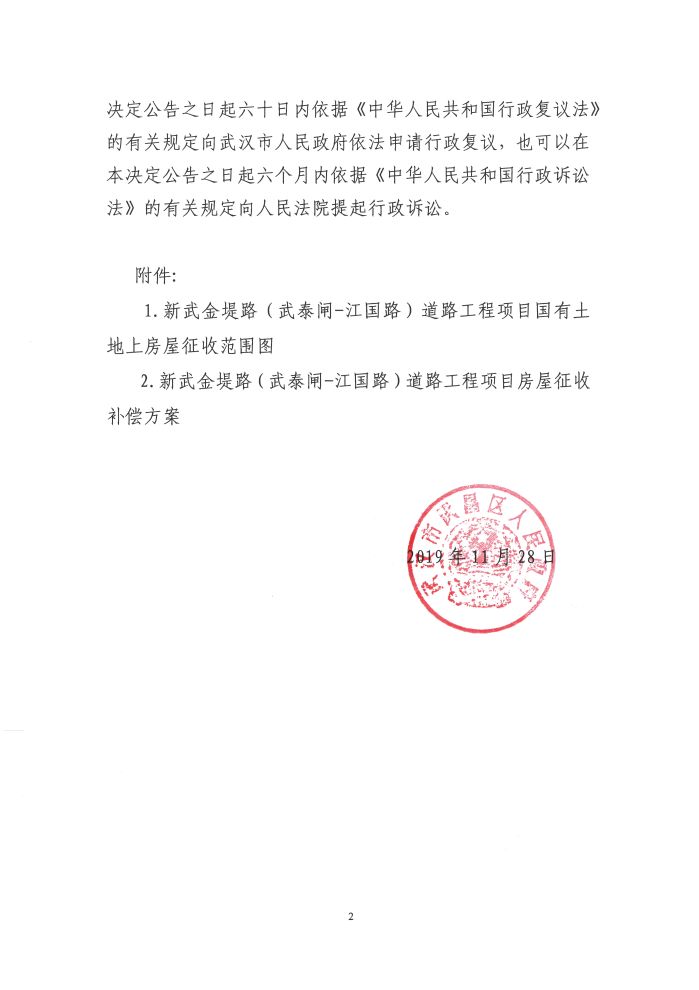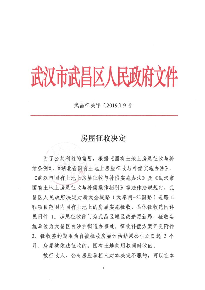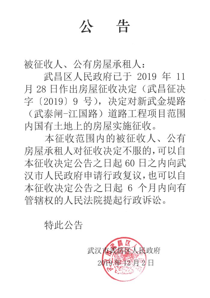 新武金堤路(武泰闸-江国路)道路工程项目房屋征收决定与公告