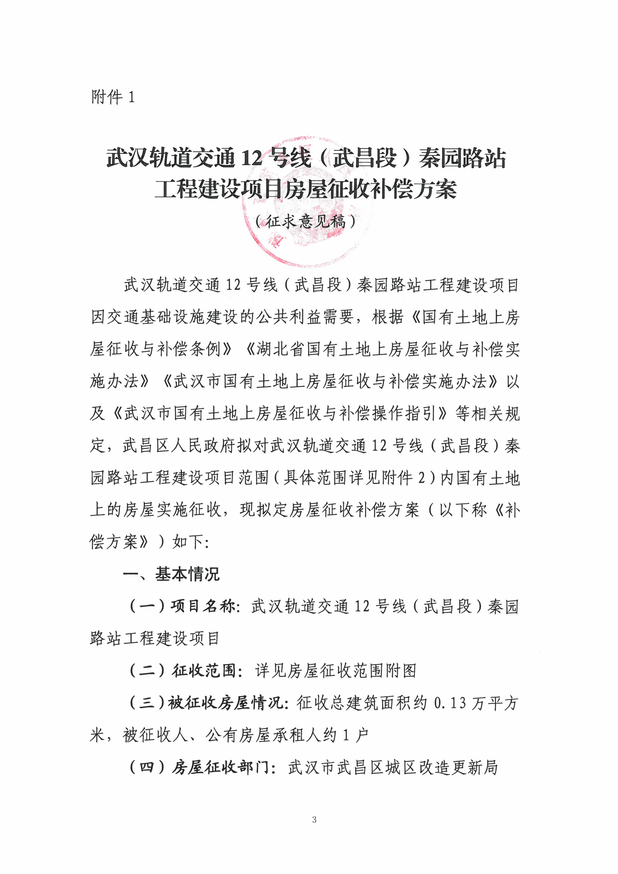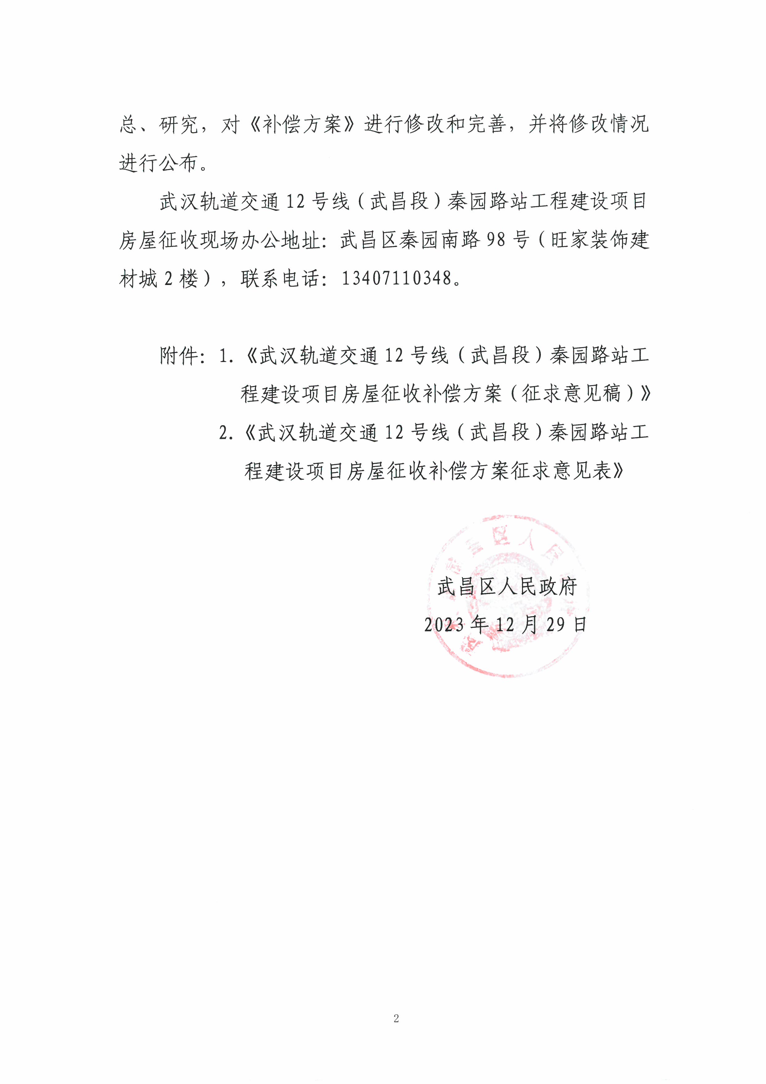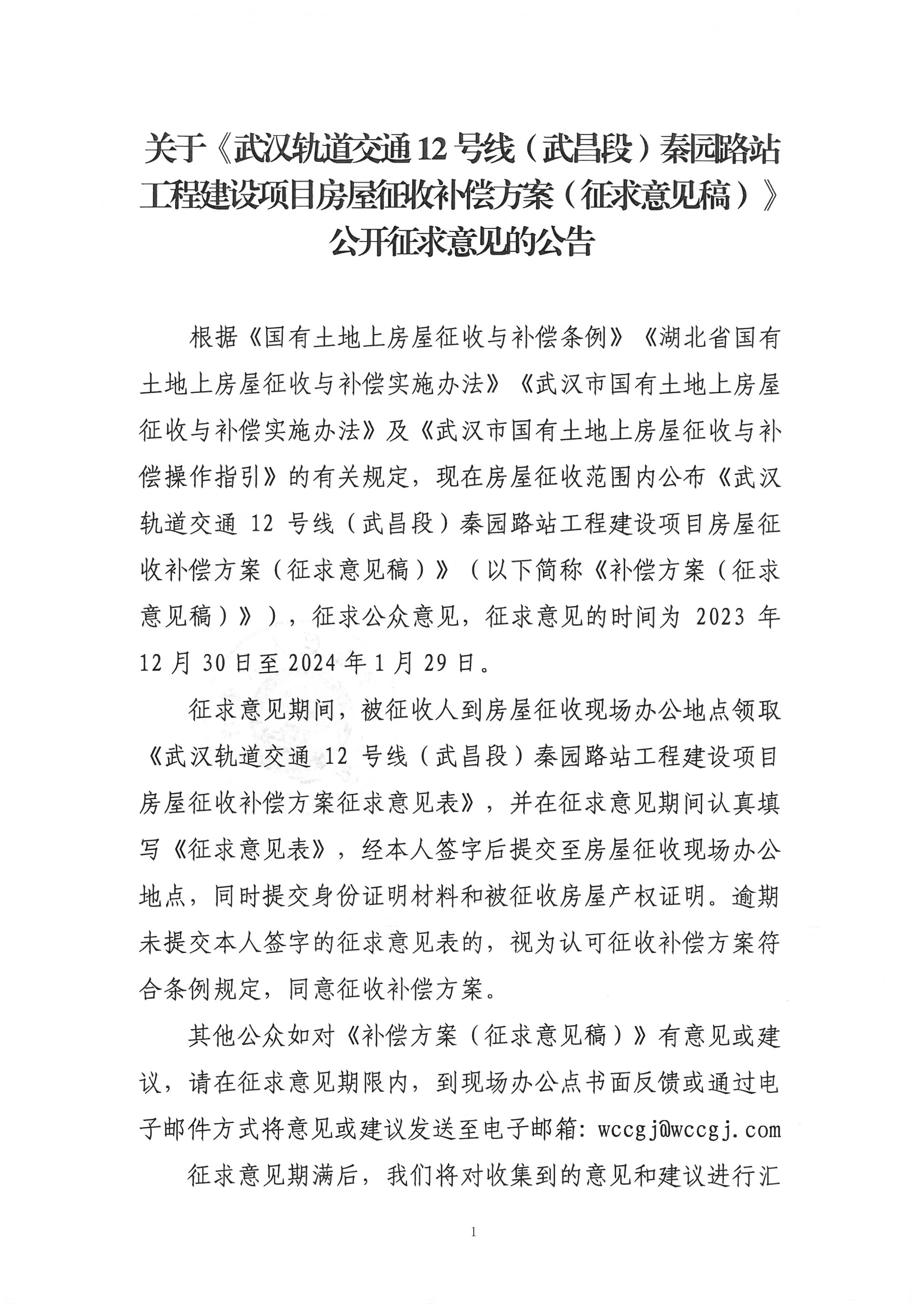 关于《武汉轨道交通12号线(武昌段)秦园路站工程建设项目房屋征收补偿方案(征求意见稿)》公开征求意见的公告