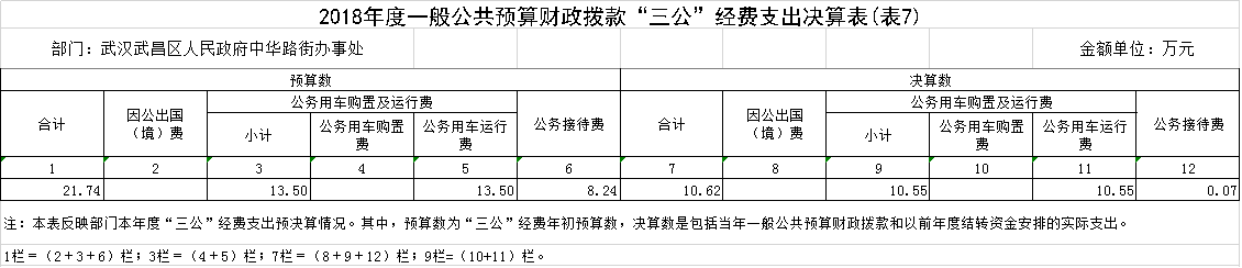 2018年度“三公”经费财政拨款年度预算数为21.74万元,支出决算为10.62万元,为预算的48.85%,其中: