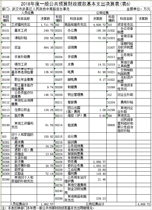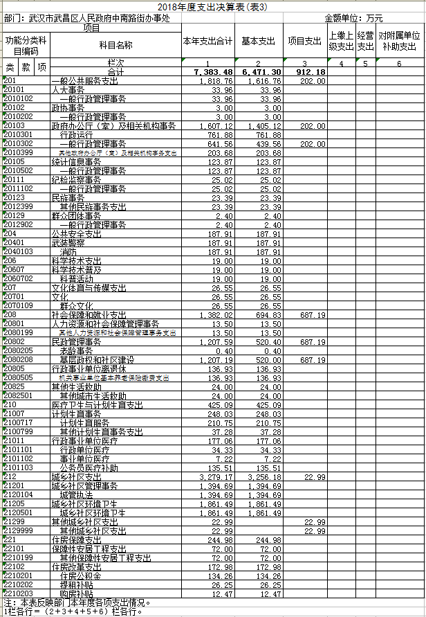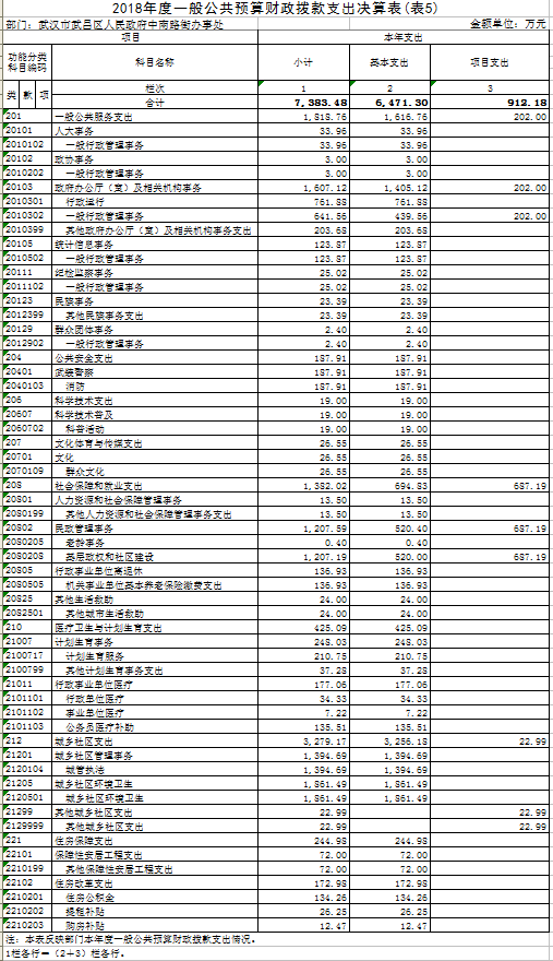 2018年一般公共预算财政拨款支出年初预算6,492.71万元,支出决算为7,383.48万元,完成年初预算113.70%。其中:基本支出6,471.30万元,项目支出912.18 万元。项目支出主要用于(1)文明创建工作经费160万元,主要成效进一步提升文明创建常态化管理水平、迎检国家及市级检查,通过文明创建常态化管理经费,文明劝导水平、宣传氛围营造、迎检工作准备等各方面得到有效落实。(2)协税工作经费30万元,主要成效优化企业发展环境,区域经济平稳发展; 紧扣服务企业、属地纳税及纳税服务,着力推进辖区经济又好又快发展,各项经济发展指标位居全区前列。全年招商引资完成101.34亿元,超额完成目标。(3)社区工作者体检27.52万元,按照中共中央国务院“共建共享,全民健康”的建设健康中国的战略部署,以中南路街领导对社区工作者体检工作要求为指导,为辖区内的社区工作者提供体检服务。(4)社区惠民资金575万,在社区推行“四民”工作法,合理利用惠民资金,在24个社区实施惠民项目共计300余项。其中楼道粉刷、防盗门的制安、楼道灯安装、破损道路维修、楼栋雨水管的更换、电动车棚的制作,社区宣传展板的制作、休闲桌椅的安装等工程项目; 购买社会组织服务;社区在各类传统节假日举行的活动及各项惠民演出活动的开展。(5)街道地方志编撰经费12万元专款专用,主要用于撰稿人员聘用、资料收集、培训、评审等经费支出。根据武昌政办【2017】10号文件精神,以“存史、资政、育人”为目标,全面、系统、客观、准确地记述街道辖区内自然、政治、经济、文化和社会等方面的历史与现状。2018年底完成初稿撰写阶段。(6)社区老旧物业经费22.99万元主要用于社区老旧物业破损设施、道路的维修维护、老旧电线整治、垃圾、杂物整治清理等。(7)第七届社区换届工作经费84.67万元主要用于24个社区居委会的换届选举工作。全街各社区换届选举工作有序推进,成功地选举产生了新一届居民委员会。现全街共有89939户,24个社区,本次换届选举共有12个社区采用户代表选举方式、11个社区采用居民代表选举方式、1个社区采用居民直接选举方式,共计登记选民71338人,共选出新一届居委会成员174人。2018年底,顺利完成了第七届社区居委会的换届选举工作。