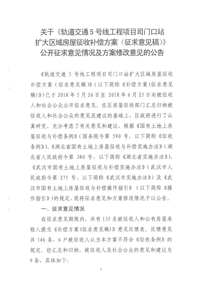 关于《轨道交通5号线工程项目司门口站扩大区域房屋征收补偿方案(征求意见稿)》公开征求意见情况及方案修改意见的公告