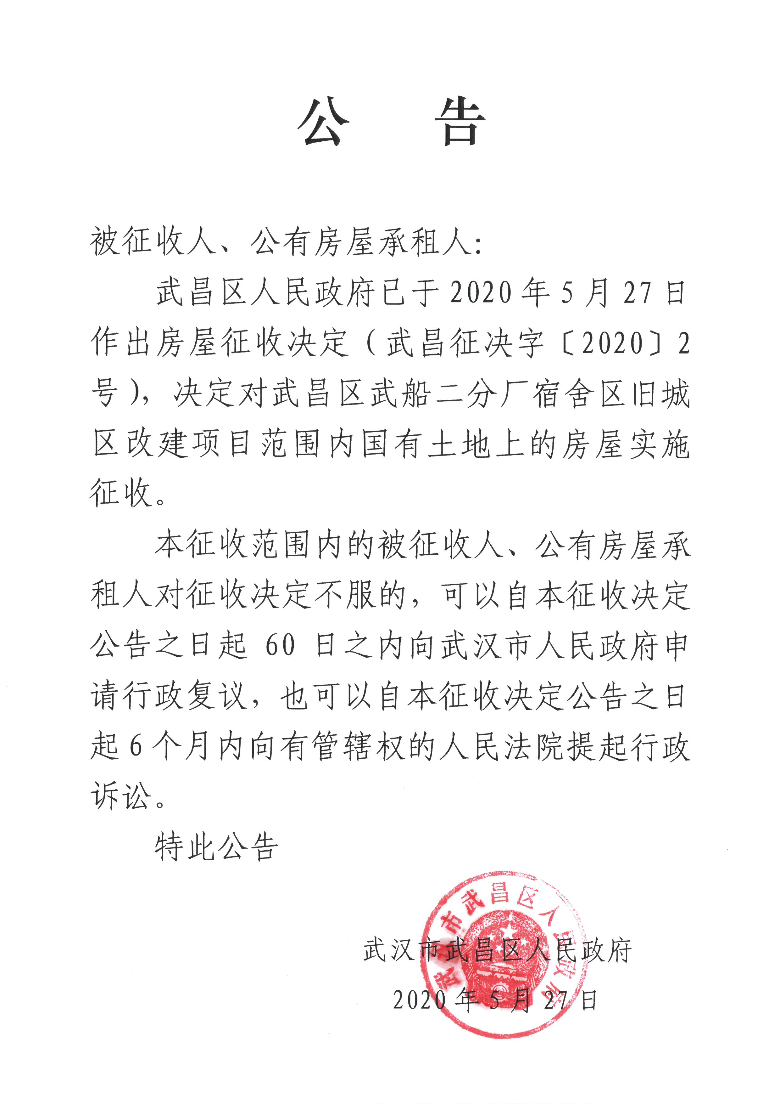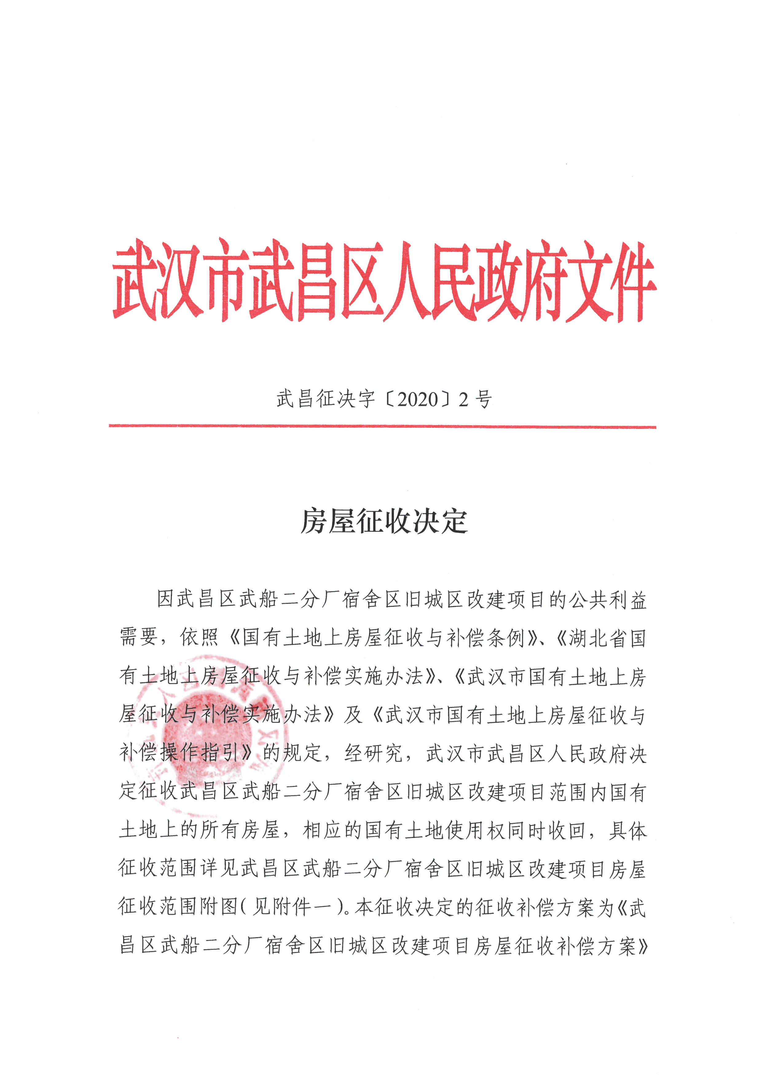 武昌区武船二分厂宿舍区旧城区改建项目房屋征收决定公告