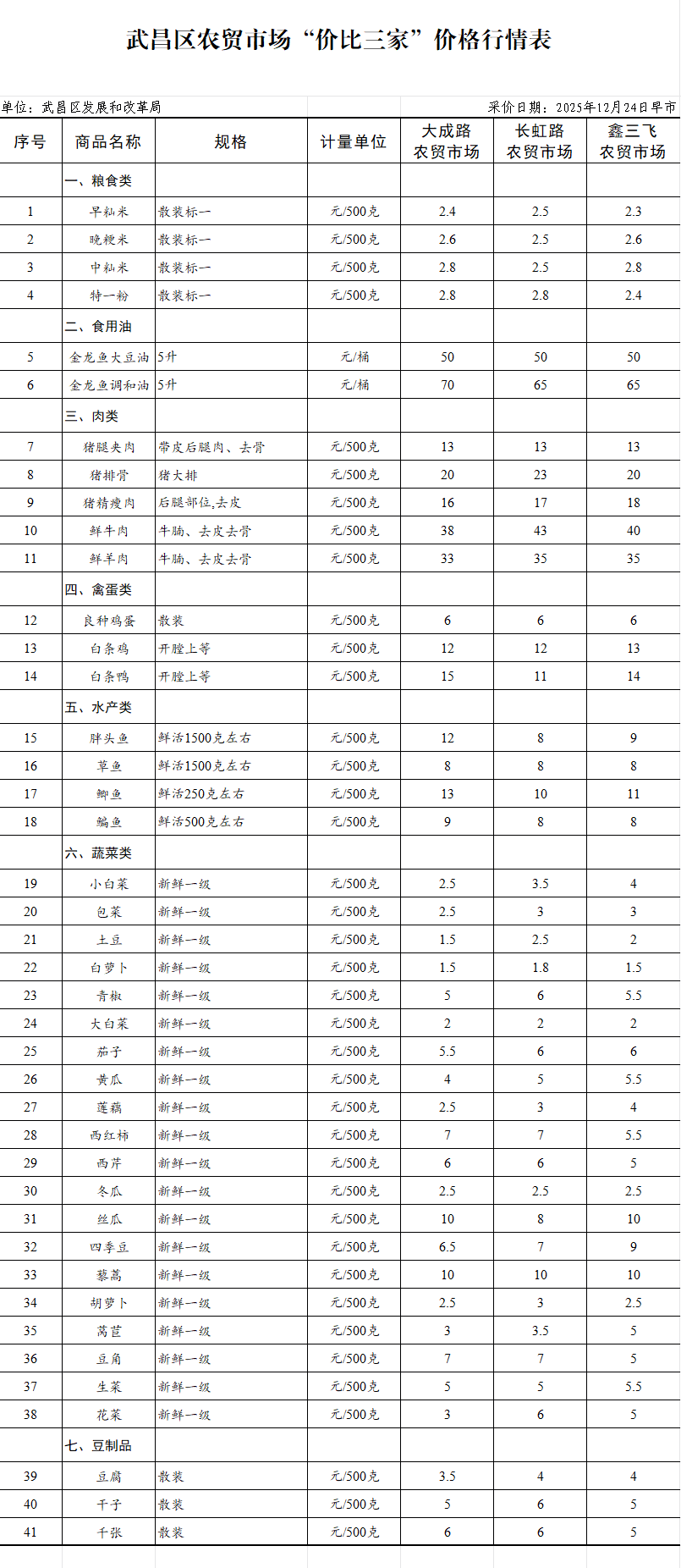 武昌区农贸市场“价比三家”价格行情表