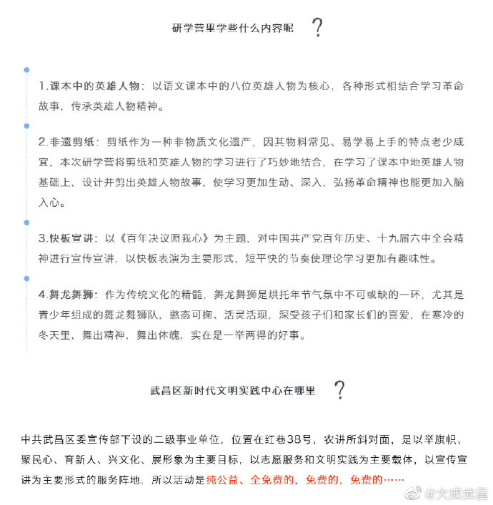【免费寒假研学营即将开营!就在武昌区新时代文明实践中心】@武昌区家长们,小学生的寒假即将来临,如何有意义地度过呢?心动的小伙伴们看这里↓↓↓“青少年红色大讲堂”寒假研学营2022年1月12日首营启动!