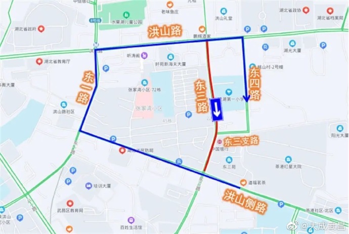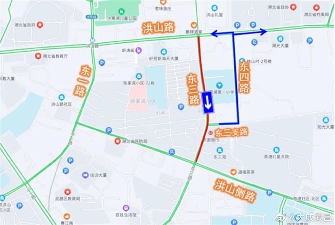 3、原经东三路往东三支路及东四路方向车辆,可绕行洪山侧路、东一路、洪山路。(极目新闻)