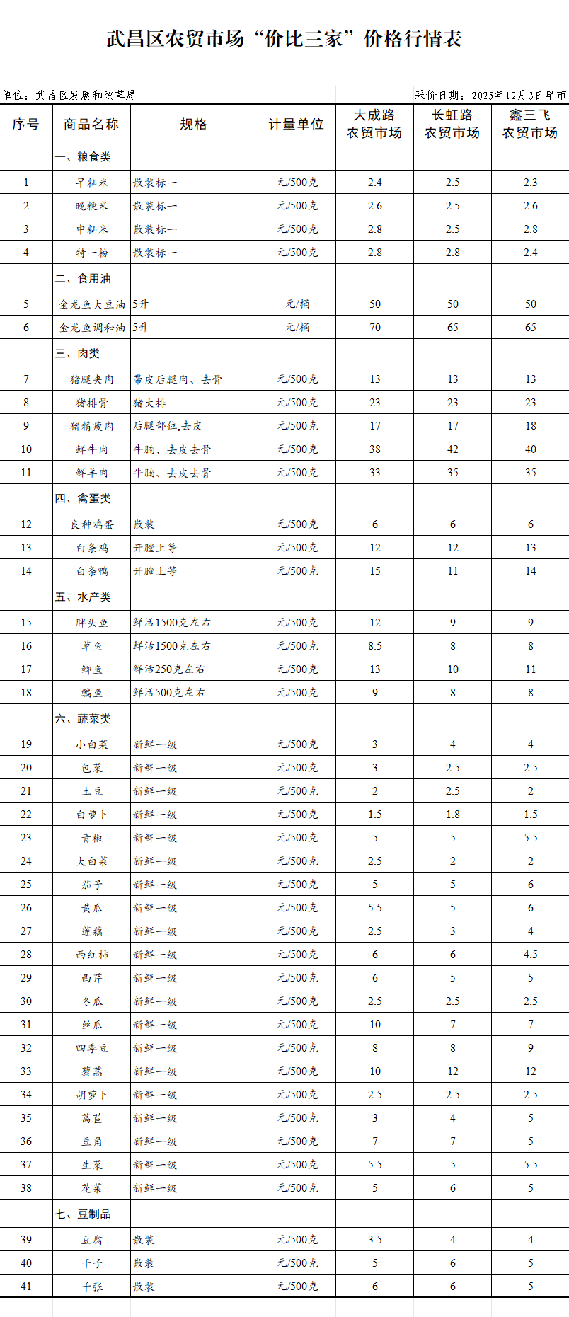 武昌区农贸市场“价比三家”价格行情表