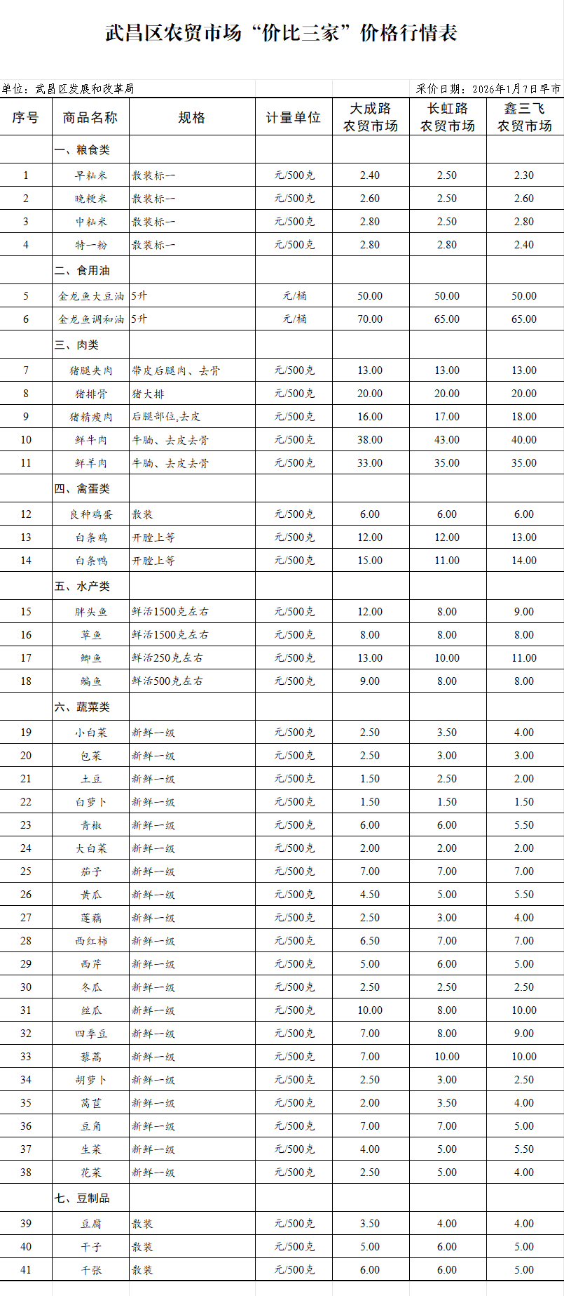 武昌区农贸市场“价比三家”价格行情表