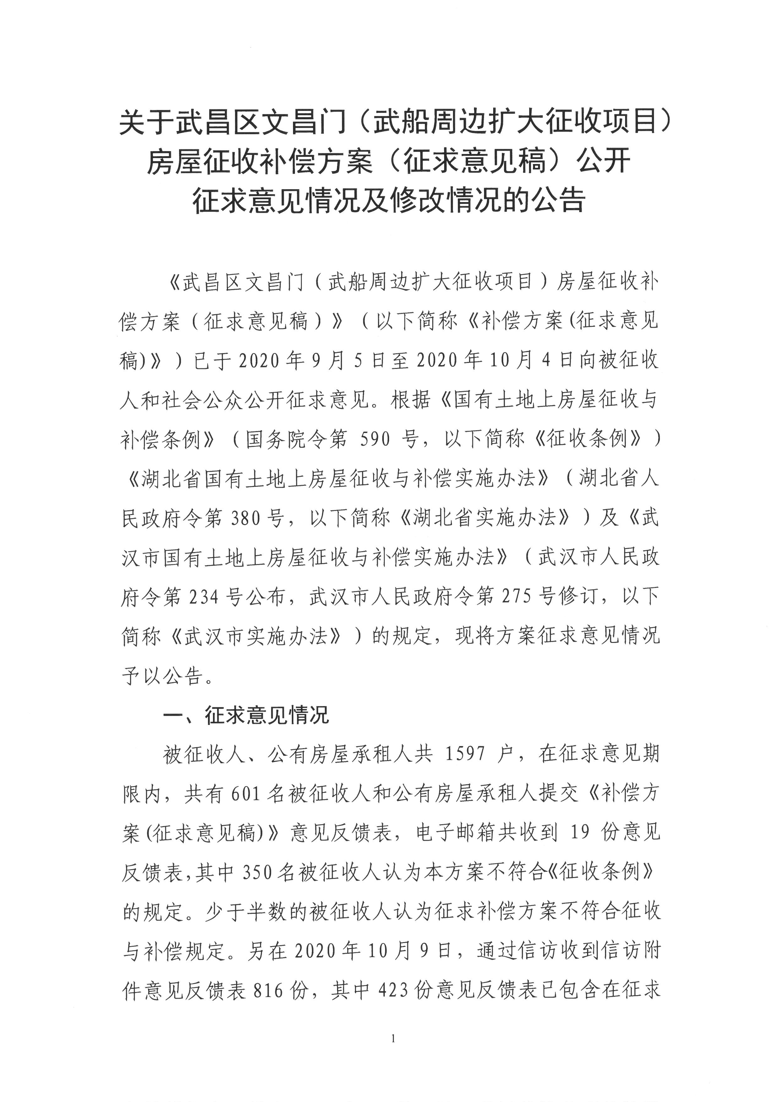 关于武昌区文昌门(武船周边扩大征收项目)房屋征收补偿方案(征求意见稿)公开征求意见情况及修改情况的公告