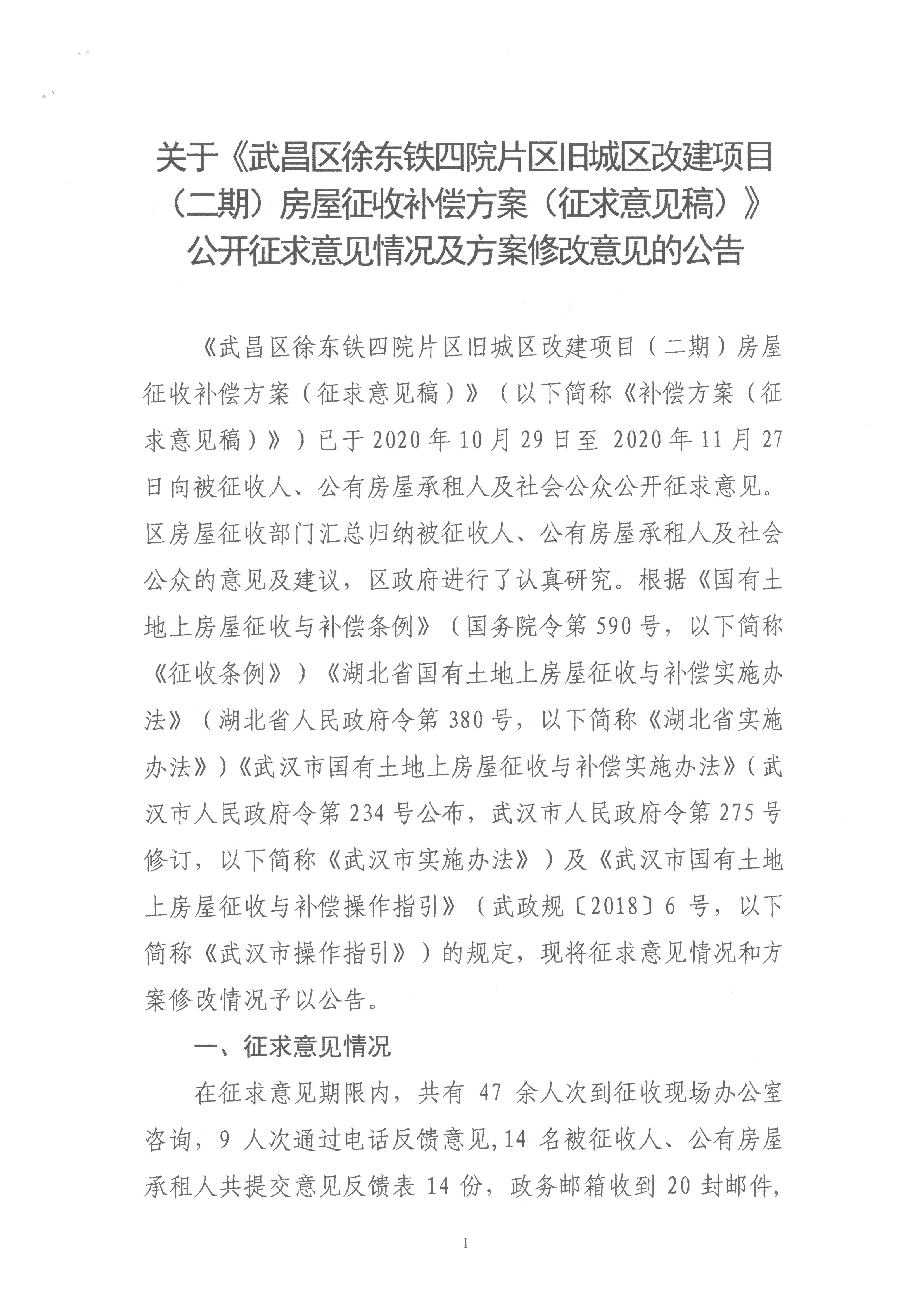 关于《武昌区徐东铁四院片区旧城区改建项目 (二期)房屋征收补偿方案(征求意见稿)》公开征求意见情况及方案修改意见的公告