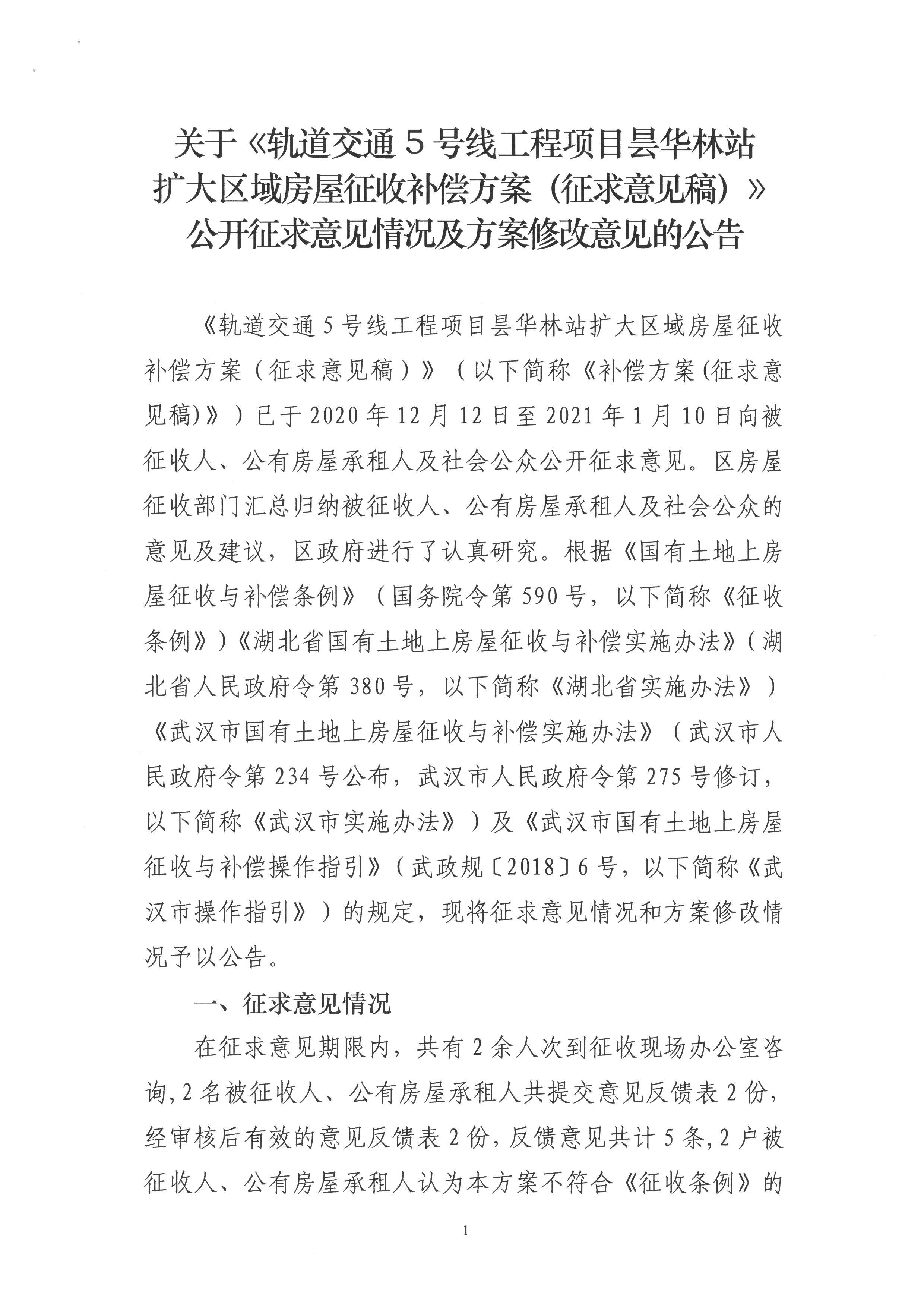 关于《轨道交通5号线工程项目昙华林站扩大区域房屋征收补偿方案(征求意见稿)》公开征求意见情况及方案修改意见的公告