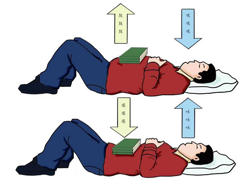 用鼻子缓慢吸气,嘴巴嘟起均匀缓慢吐气,吸气时最大限度地向外扩张腹部,胸部保持不动;吐气时,最大限度地向内收缩腹部,胸部保持不动。吸气3秒,吐气6秒。训练时间3分钟为宜。