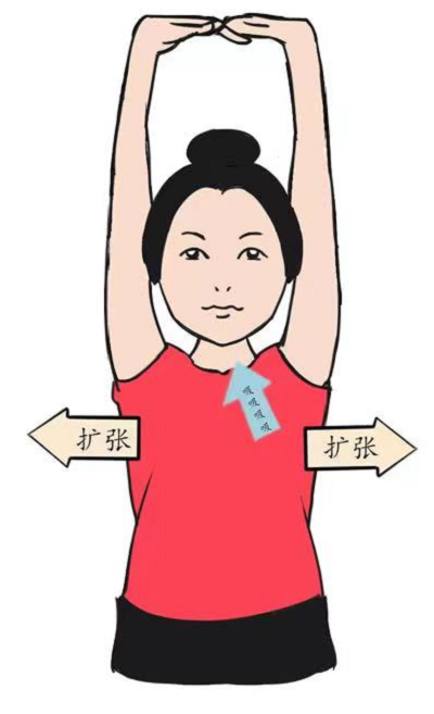 双手抱头,吸气时抬头挺胸,双手向外打开,吐气时,低头缩胸,双手收拢。 双手外展90度,用鼻缓慢深吸气,同时双手向两侧最大范围的张开,经口吐气时,双手肘互相靠拢,在胸前相贴近。用鼻缓慢深吸气,吸气后,屏气保持3秒,身体前倾,张大嘴,快而短促的连哈3次气。再次用鼻缓慢深吸气后屏气保持3秒,调动胸、腹肌力量,完成1次响亮有力的咳嗽。避免用嗓子发音出现清嗓子的行为,这不是正确的咳嗽方式。