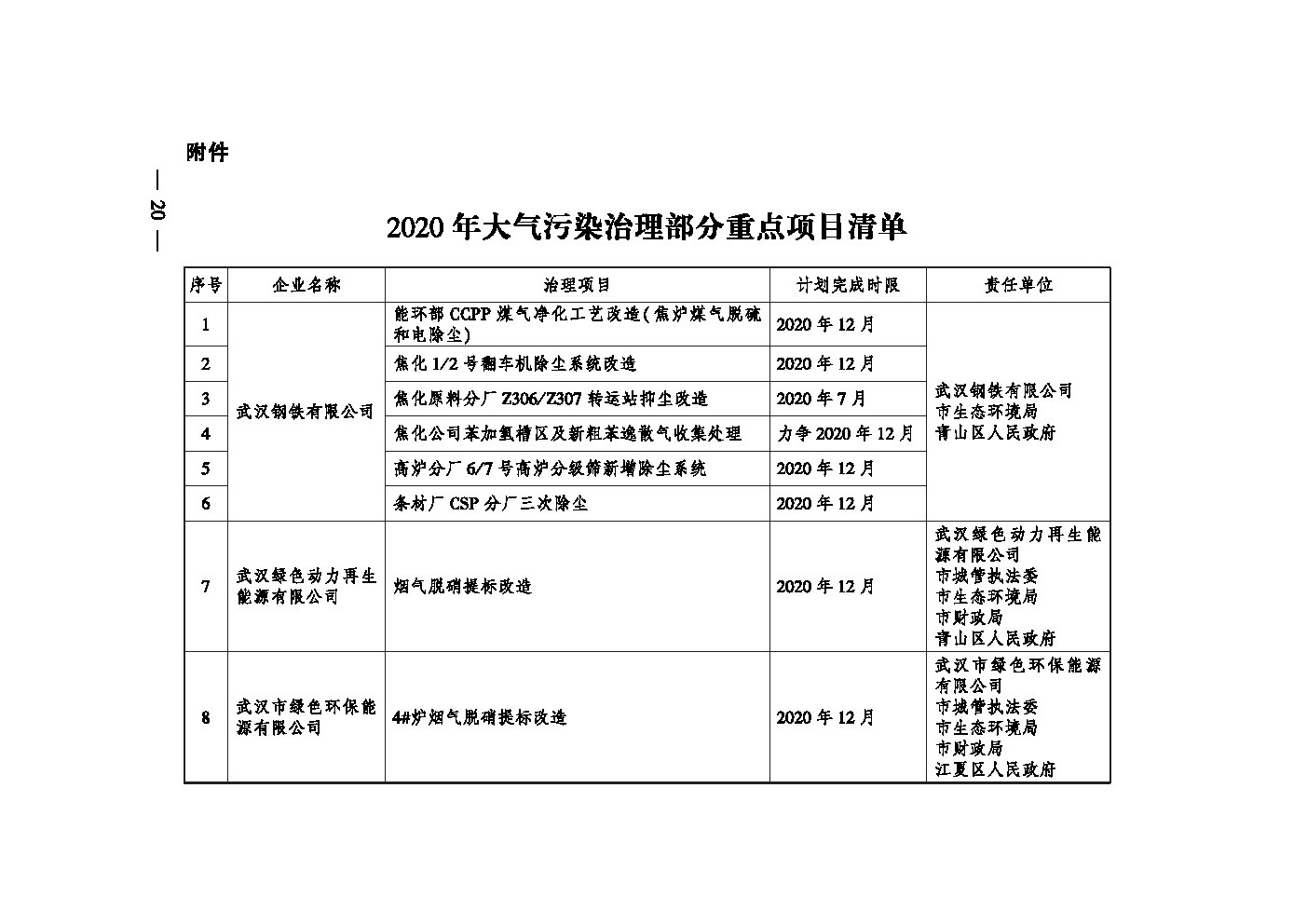 1.实施钢铁行业超低排放改造。钢铁行业企业对照省级钢铁行业超低排放改造要求,开展自查并建立超低排放改造任务清单,并于2020年7月底之前报本辖区生态环境部门备案,于2020年底之前书面报告超低排放改造情况。企业实施超低排放改造的项目,应当在改造后3个月内书面告知本辖区生态环境部门;根据生态环境管理需要,生态环境部门按照超低排放标准对其开展环境管理。(责任单位:市生态环境局,青山、江夏区人民政府)