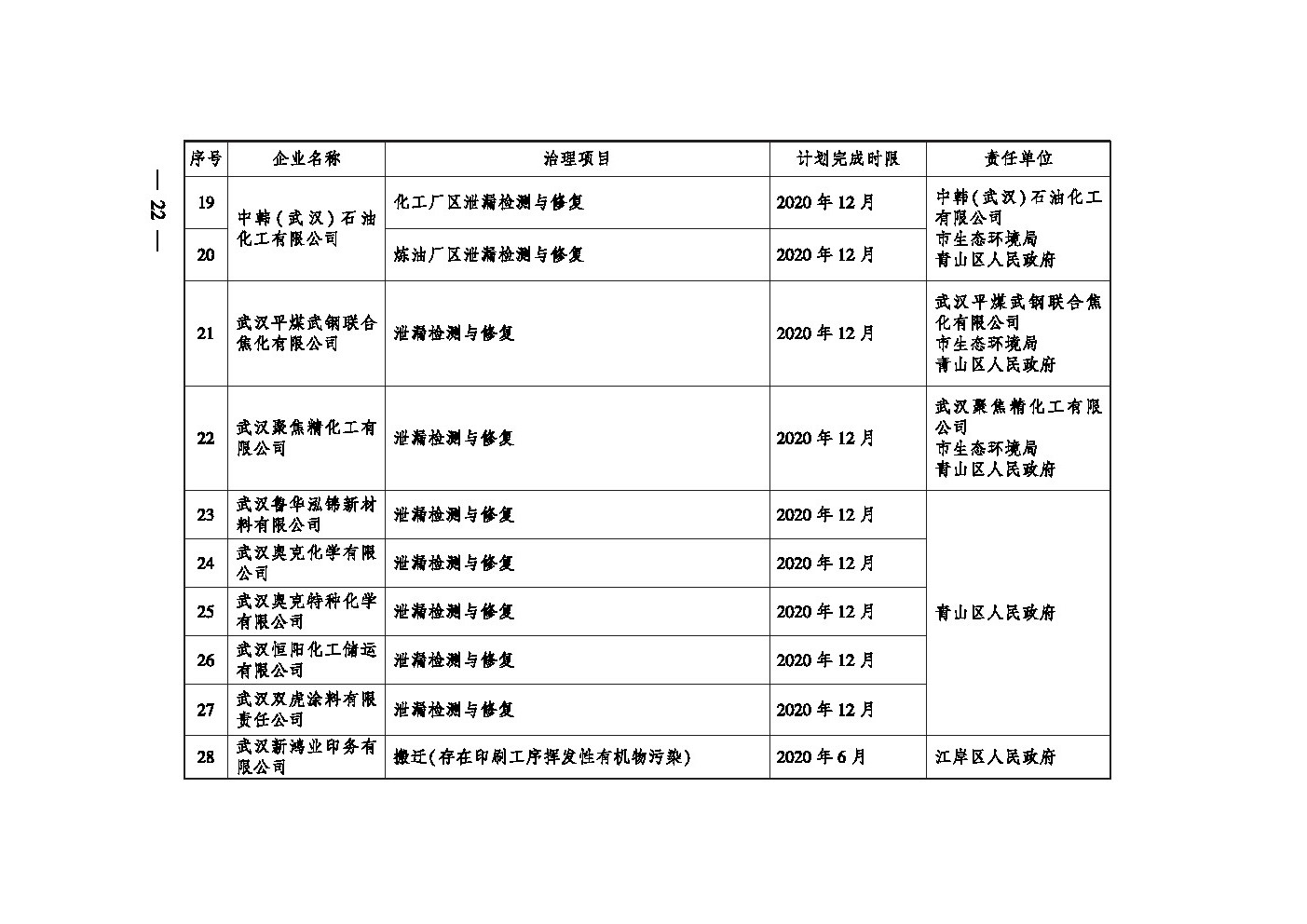 5.推进重点企业清洁生产。发展改革、生态环境部门组织推进清洁生产审核,汉阳、青山、蔡甸、江夏、东西湖、黄陂、新洲区和武汉东湖新技术开发区、武汉经济技术开发区(汉南区)分别完成不少于2家重点企业清洁生产审核。(责任单位:市发展改革委、市生态环境局,各区人民政府)